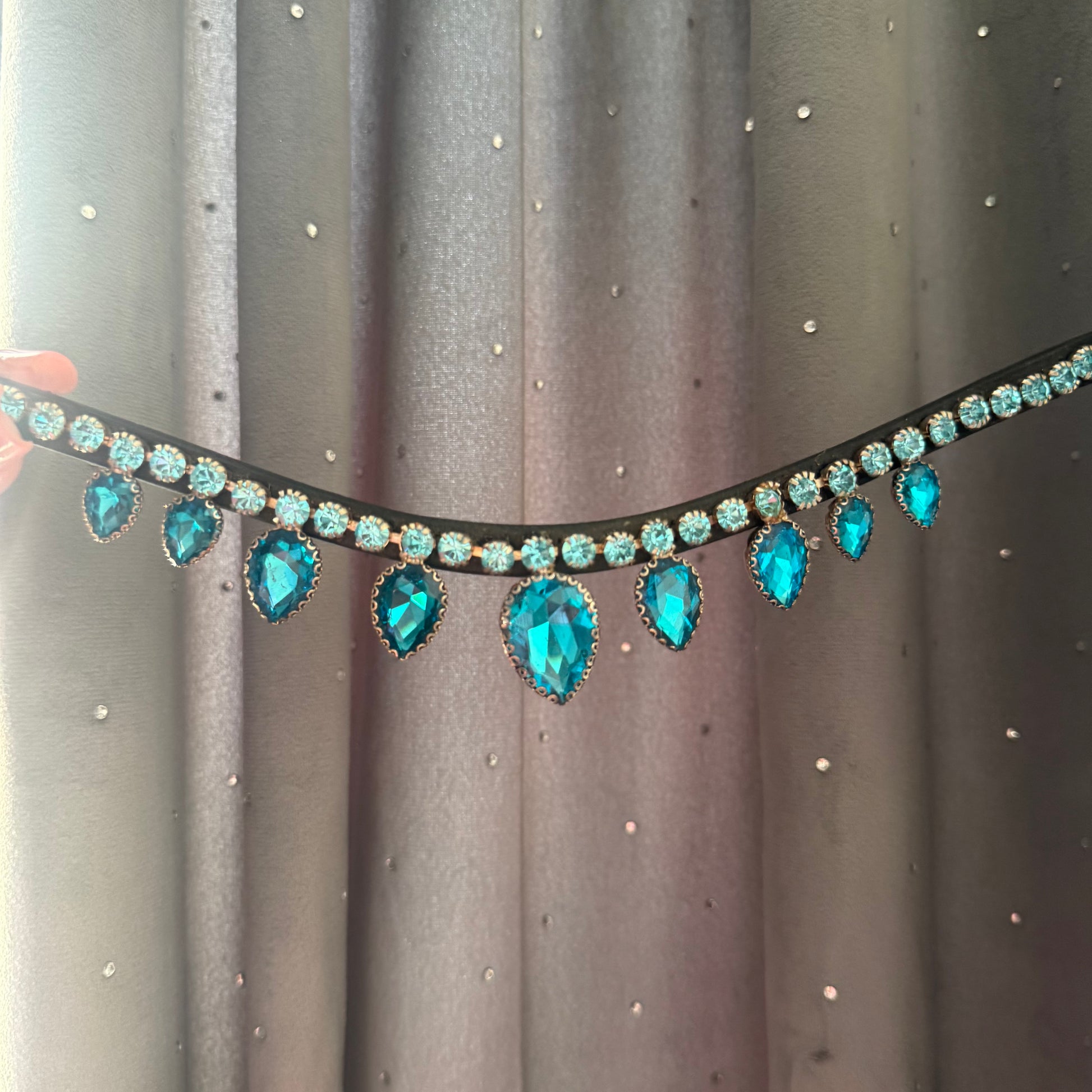 AzureDrop is our signature teardrop browband in a captivating azure blue, designed to add a touch of class to your horse's tack. Its unique design combines the sophistication of the teardrop shape with the serenity of sky blue, creating an accessory that stands out both on the track and in the paddock.