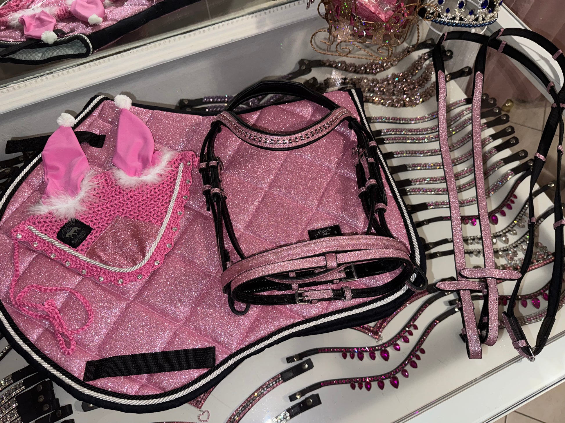 Bellissimo sottosella sagomato con interno in nido d’ape, colore rosa chiaro glitter, abbinato a cuffietta natalizia coordinata. Disponibile anche la testiera abbinata con redini per questo fantastico set 🎀🐴