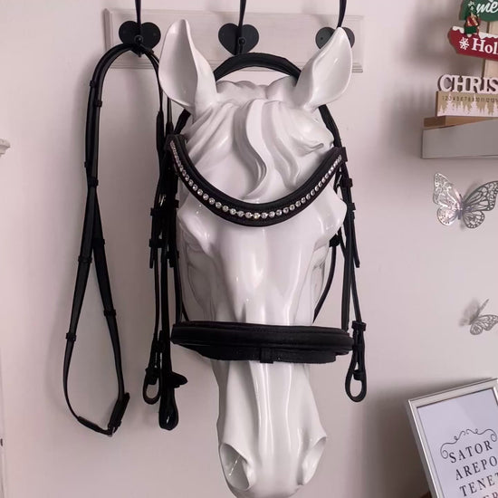 Elegant and refined, this all-black glitter bridle comes complete with perfectly coordinated reins, noseband, and browband. The browband, also in black glitter, is embellished with a delicate row of clear rhinestones in the center, for a subtle yet classy touch of sparkle. An accessory that combines style and practicality, ideal for standing out with elegance. 🖤