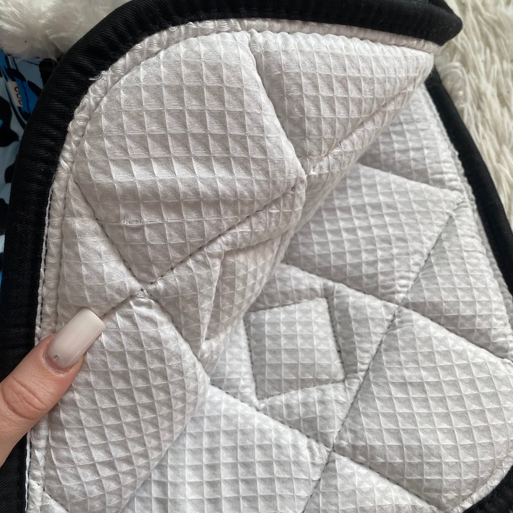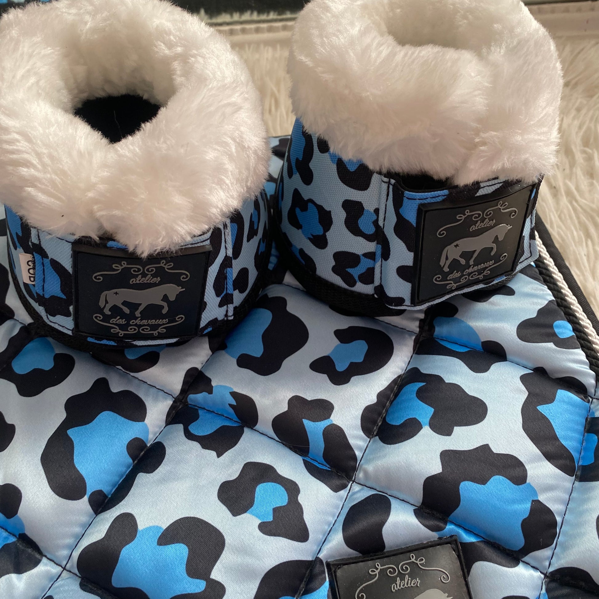 Set composto da sottosella, cuffietta e paraglomi in fantasia leopardata senza glitter. Il sottosella offre comfort e traspirabilità, mentre la cuffietta presenta orecchie realizzate in tessuto elasticizzato, garantendo una vestibilità stabile e confortevole. I paraglomi assicurano una protezione efficace agli zoccoli.