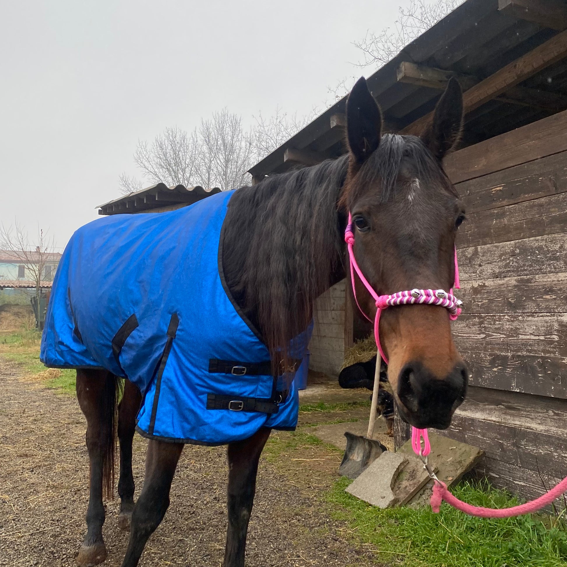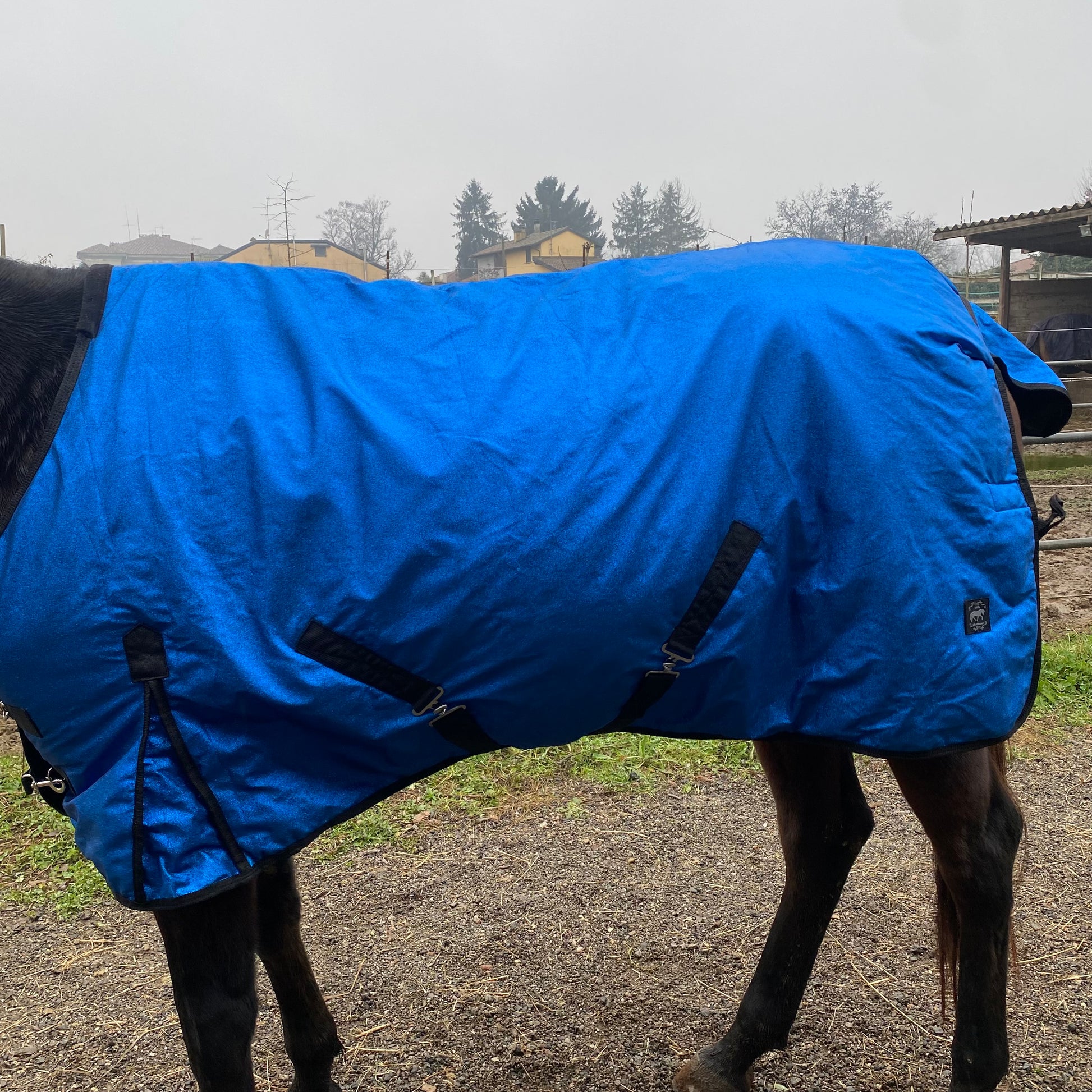 Coperta imbottita ideale per passeggiate o foto. Non impermeabile. Morbida e confortevole, realizzata con dettagli in glitter blu elettrico che donano un effetto luminoso ed elegante. Perfetta per momenti speciali e per aggiungere un tocco scenografico al look del cavallo.