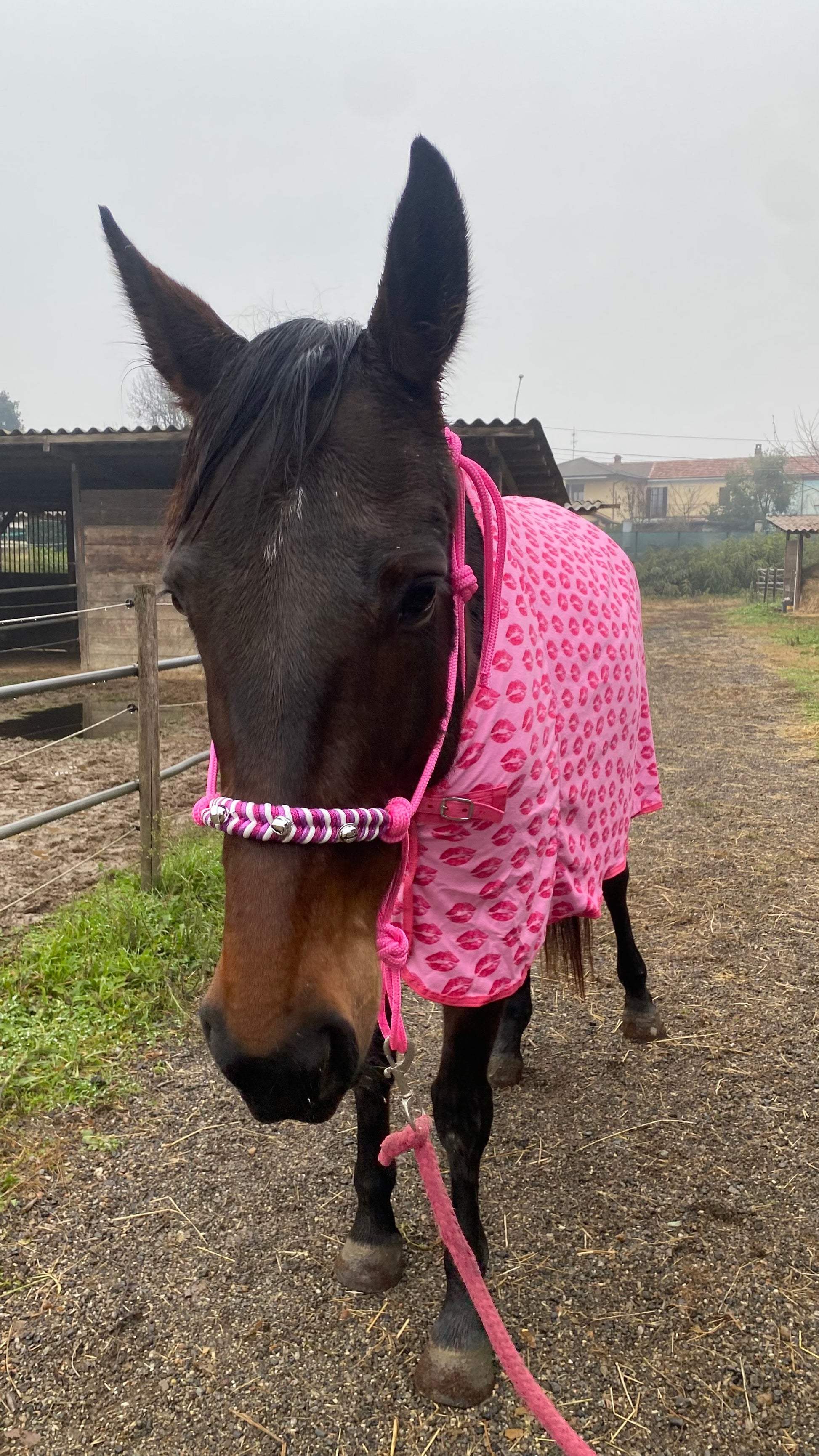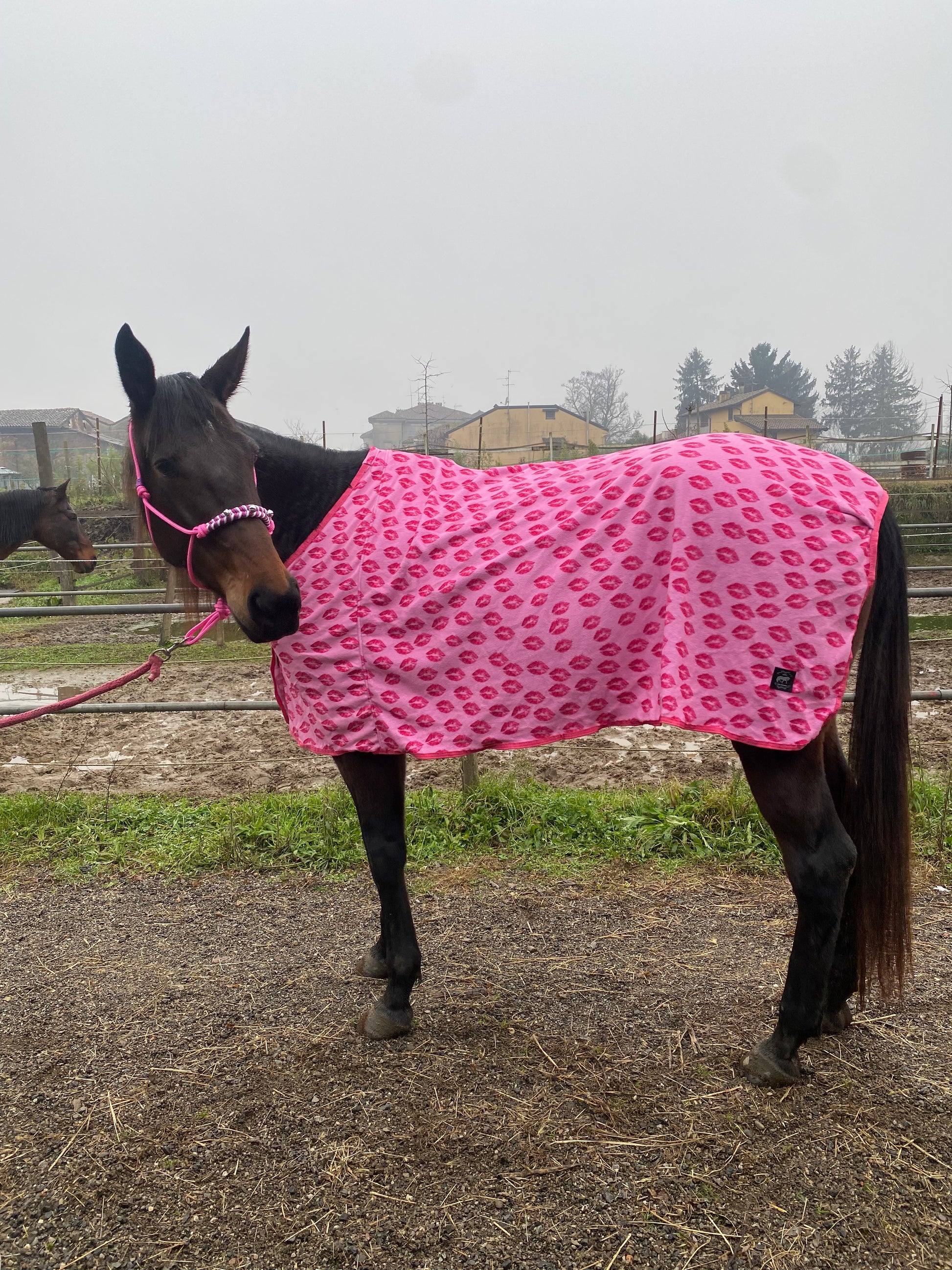 Coperta in pile morbido confortevole, ideale per mantenere il cavallo al caldo durante toelettatura, box, passeggiate o trasporto. Il design è caratterizzato da una delicata fantasia a baci, che aggiunge un tocco unico e affettuoso senza rinunciare alla praticità.