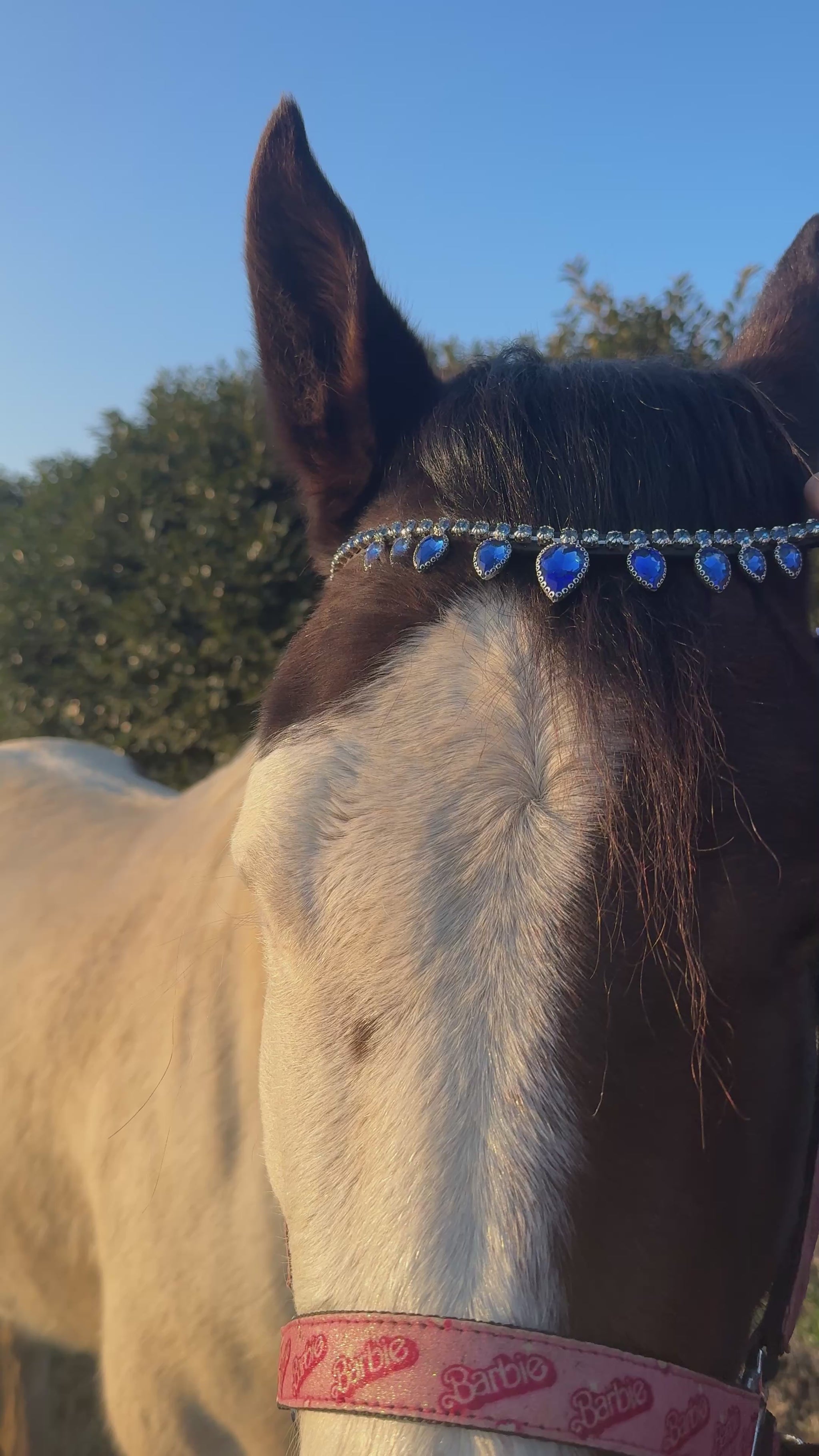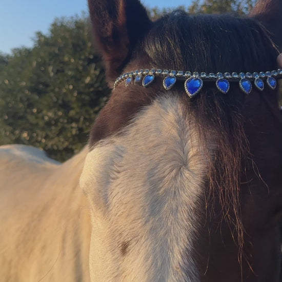 Frontalino per cavallo in cuoio con gocce e fila di brillantini color blu, perfetto per un look deciso ed elegante. Un accessorio che valorizza la testiera con discreta luminosità. Il bottoncino laterale permette una rimozione rapida e pratica. Realizzato con materiali resistenti e attenzione ai dettagli.