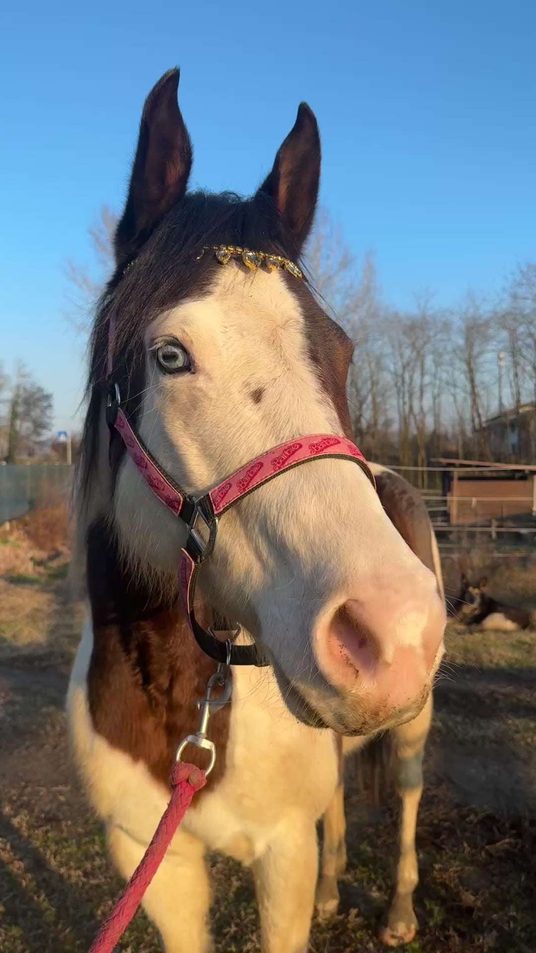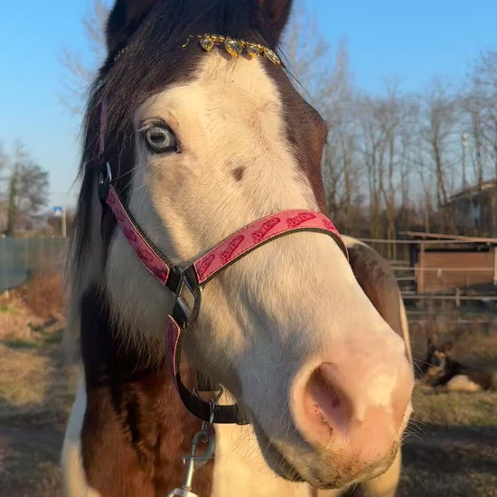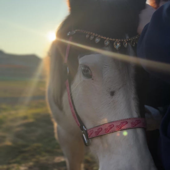 Frontalino per cavallo in cuoio con gocce decorative e fila di brillantini color oro, perfetto per un look elegante e raffinato. Ideale sia per l’uso quotidiano che per occasioni speciali. Il bottoncino laterale consente una rimozione facile e veloce dalla testiera. Materiali di qualità e finiture precise per un risultato luminoso e resistente.