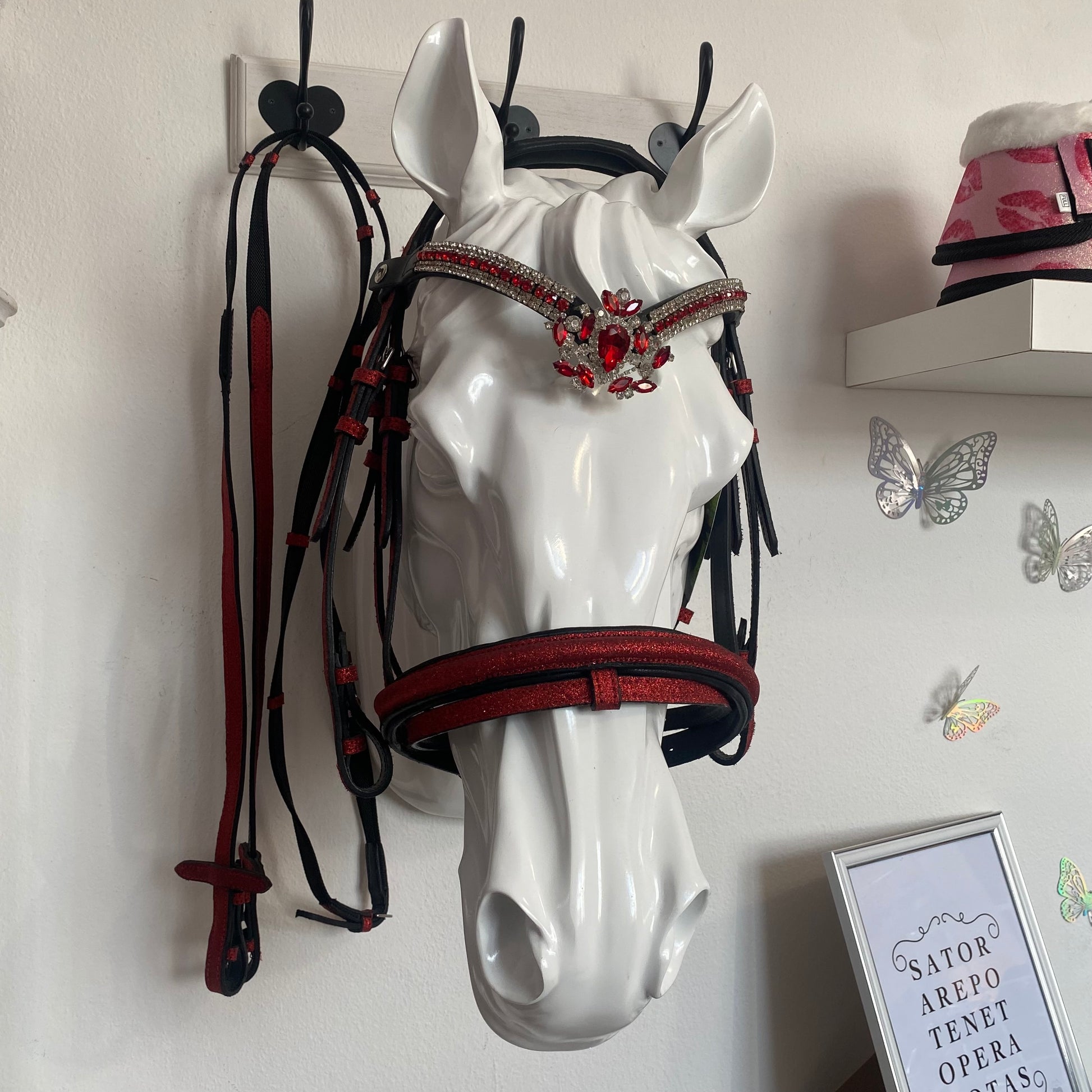 Testiera rosso glitter dallo stile unico e luminoso, caratterizzata da splendide redini che aggiungono un tocco deciso e raffinato. Il frontalino, impreziosito da diamanti argentati e rossi, cattura la luce ad ogni movimento, mentre il diamante centrale crea un punto focale elegante e ricercato. Un accessorio perfetto per chi desidera un look brillante, distintivo e di grande effetto.