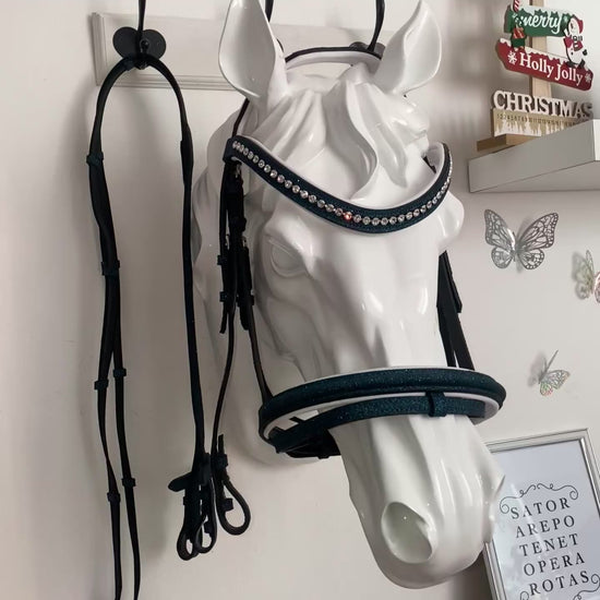 Aggiungi un tocco di originalità e stile al tuo equipaggiamento con questa elegante testiera glitterata blu, completa di redini coordinate. Realizzata con materiali resistenti e rifiniti con cura, unisce funzionalità e design per chi non vuole passare inosservato. Il rivestimento glitter dona un effetto brillante unico, perfetto per chi ama distinguersi anche in sella.