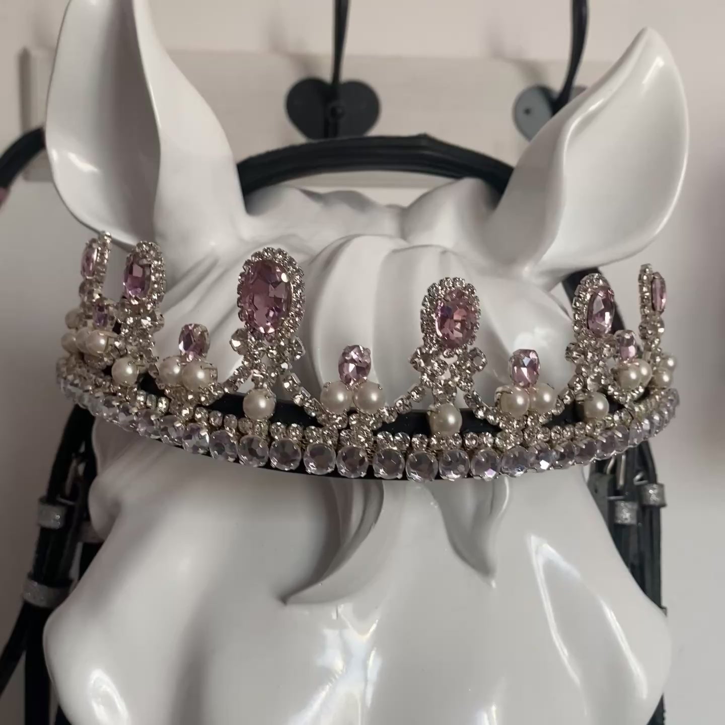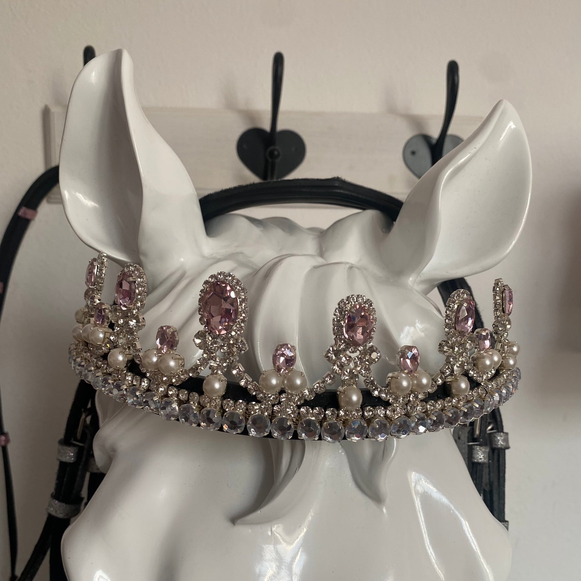 Corona in cuoio dall’eleganza luminosa, caratterizzata da una fascia di brillantini argentati nella parte inferiore e da splendidi cristalli rosa chiaro nella parte superiore, più grandi e posizionati sulle punte per un effetto regale e delicato. Il frontalino è dotato di bottoncini laterali, che permettono di rimuoverlo e sostituirlo rapidamente dalla testiera, garantendo praticità e versatilità. Perfetto per foto, eventi e occasioni speciali, dona un tocco raffinato e romantico a ogni uscita.