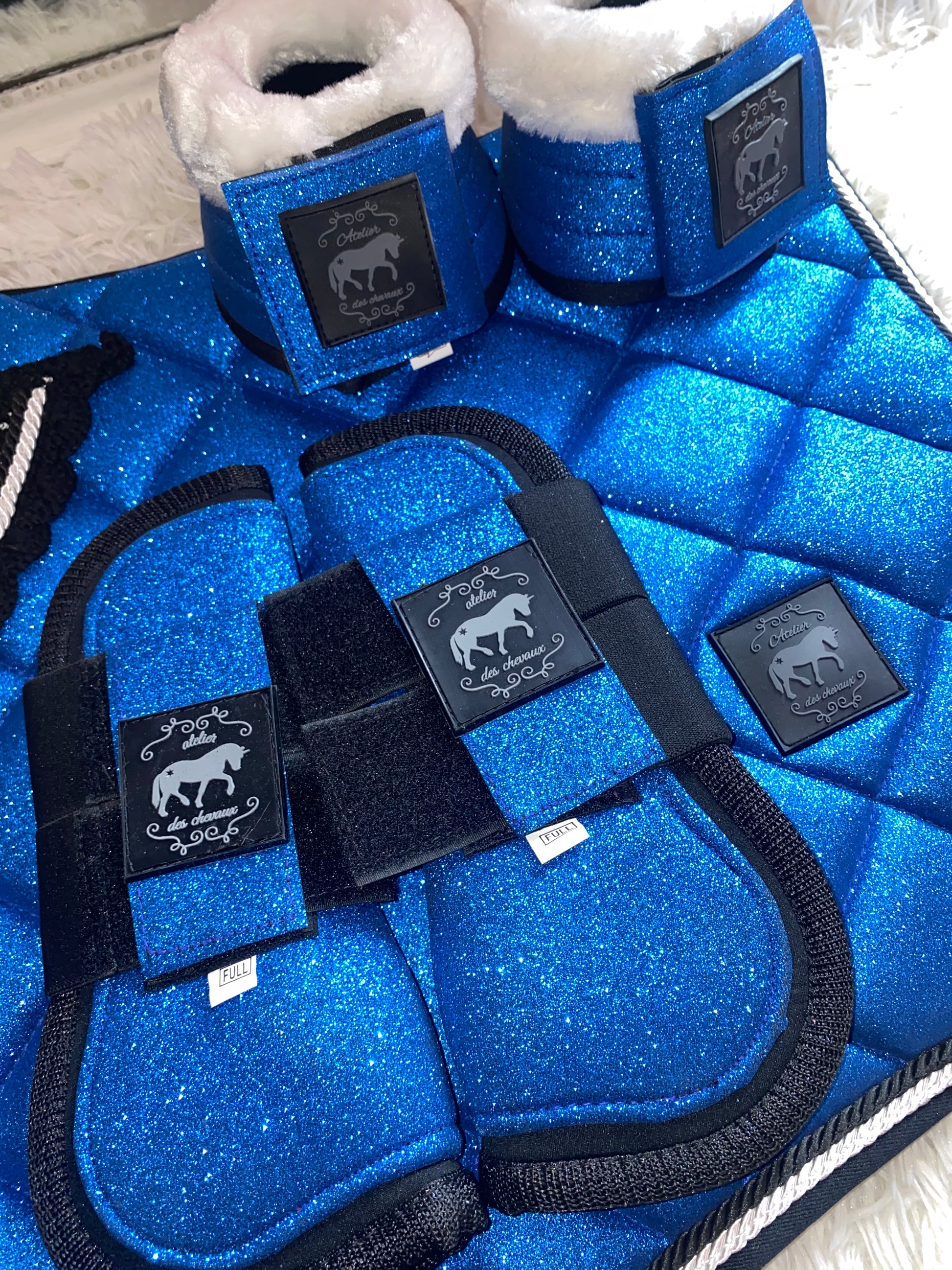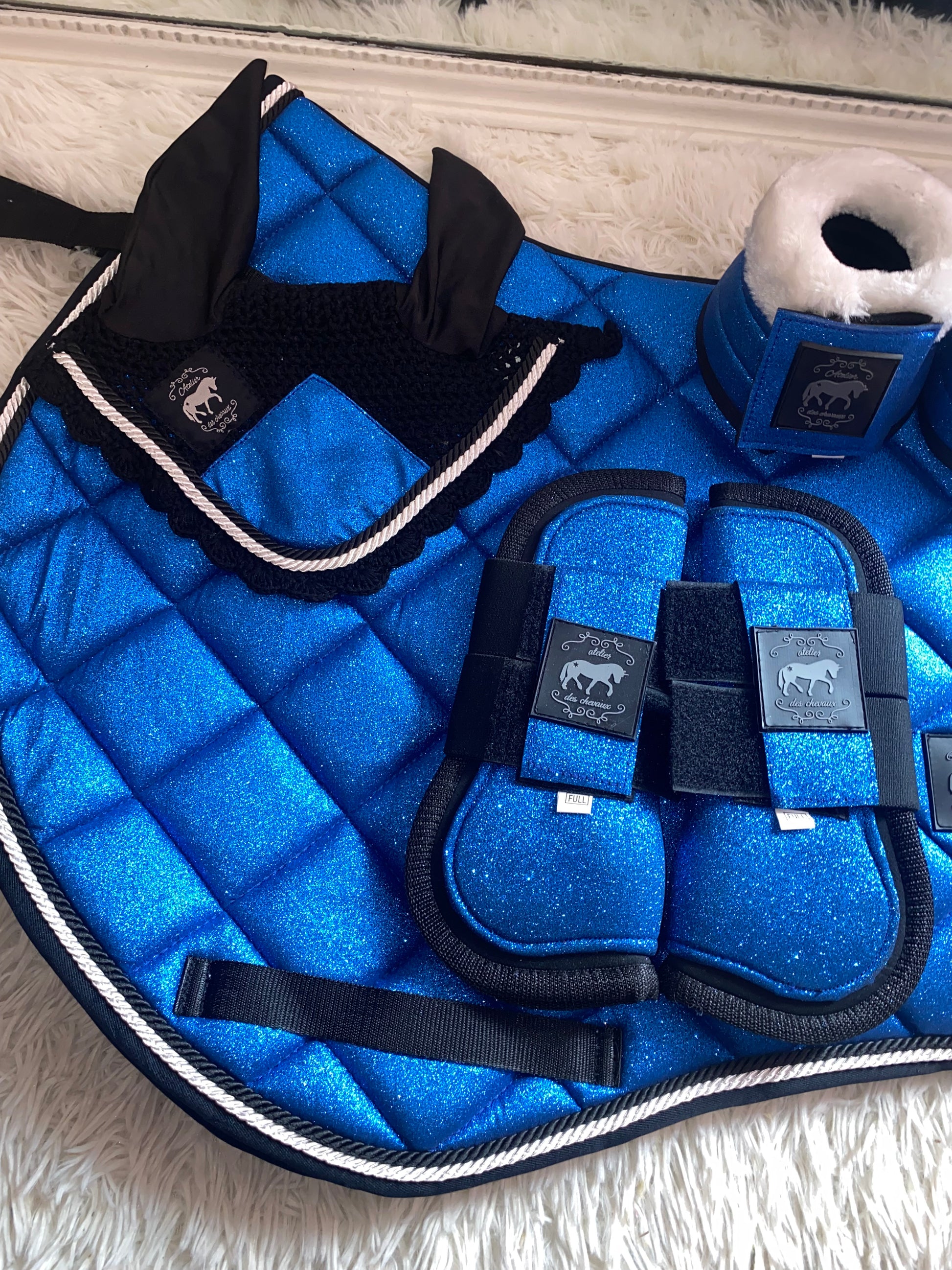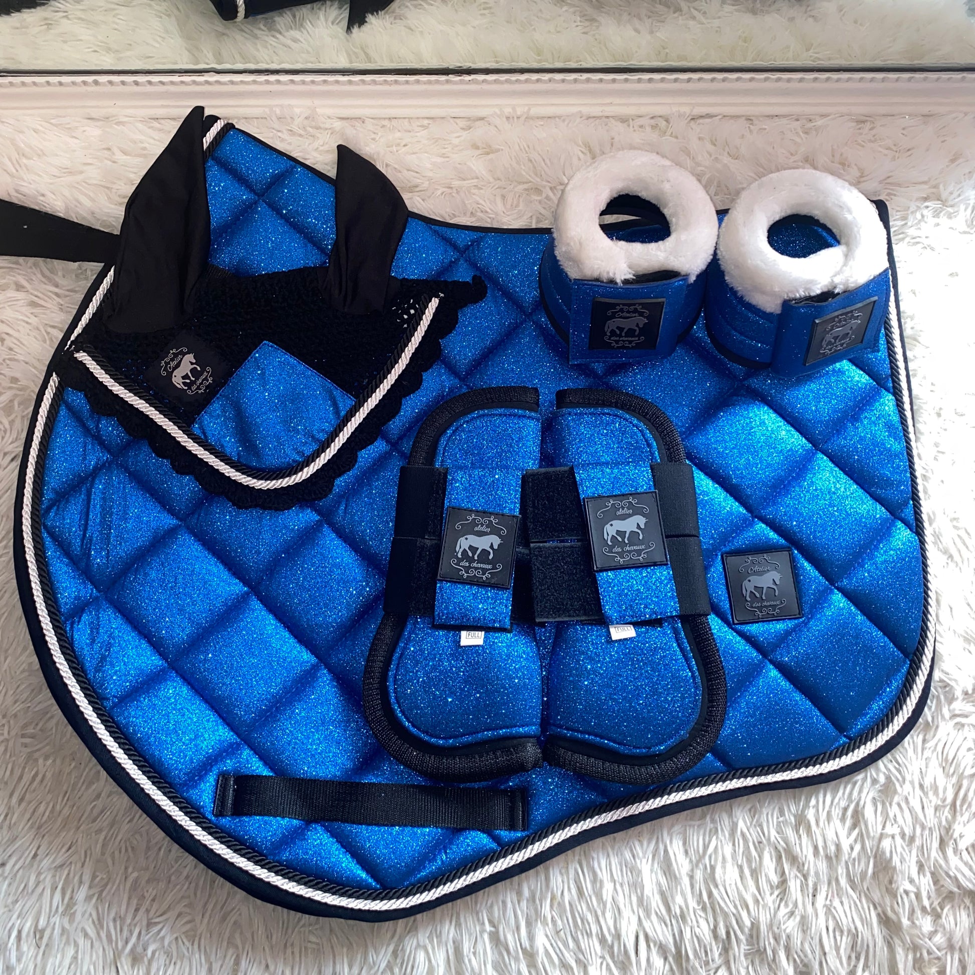 Un set dal look audace e brillante, perfetto per chi ama uno stile unico! Il sottosella glitter blu elettrico, con interno in nido d’ape, garantisce comfort e traspirabilità. La cuffietta, con orecchie in lycra decorate da dettagli brillanti e bordo con brillantini, completa il look insieme a stinchiere e paraglomi abbinati. 💙🐎