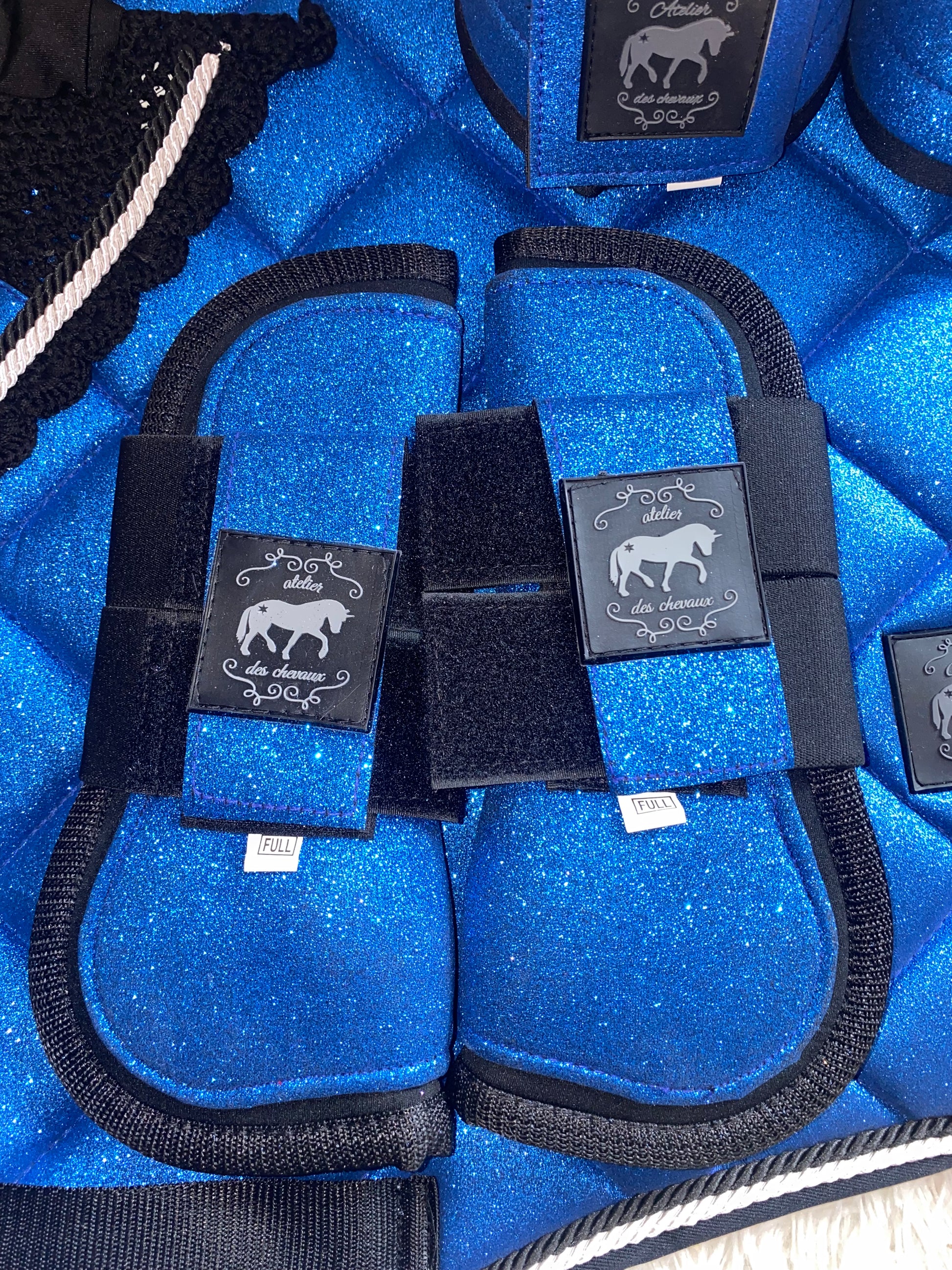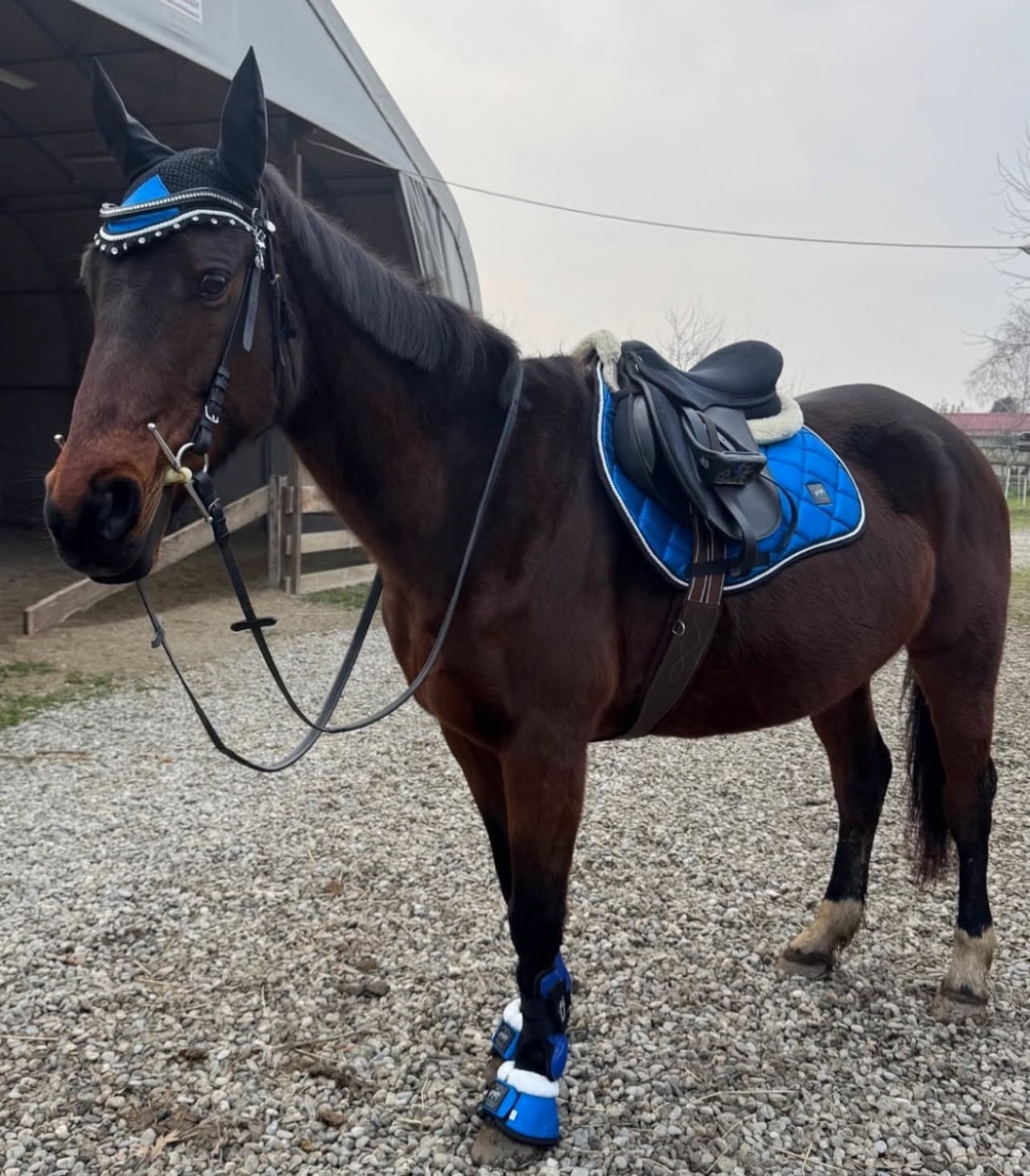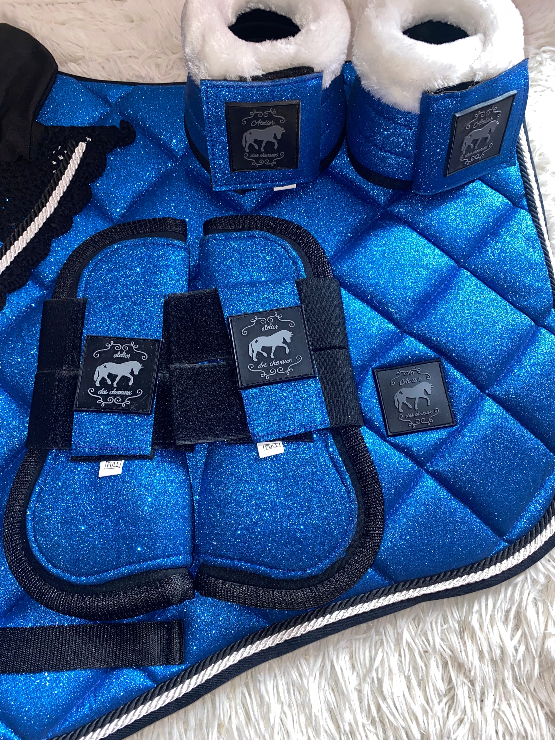Un set dal look audace e brillante, perfetto per chi ama uno stile unico! Il sottosella glitter blu elettrico, con interno in nido d’ape, garantisce comfort e traspirabilità. La cuffietta, con orecchie in lycra decorate da dettagli brillanti e bordo con brillantini, completa il look insieme a stinchiere e paraglomi abbinati. 💙🐎