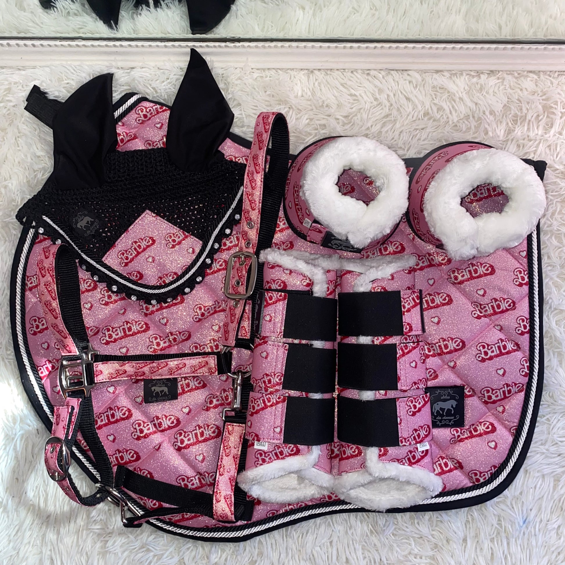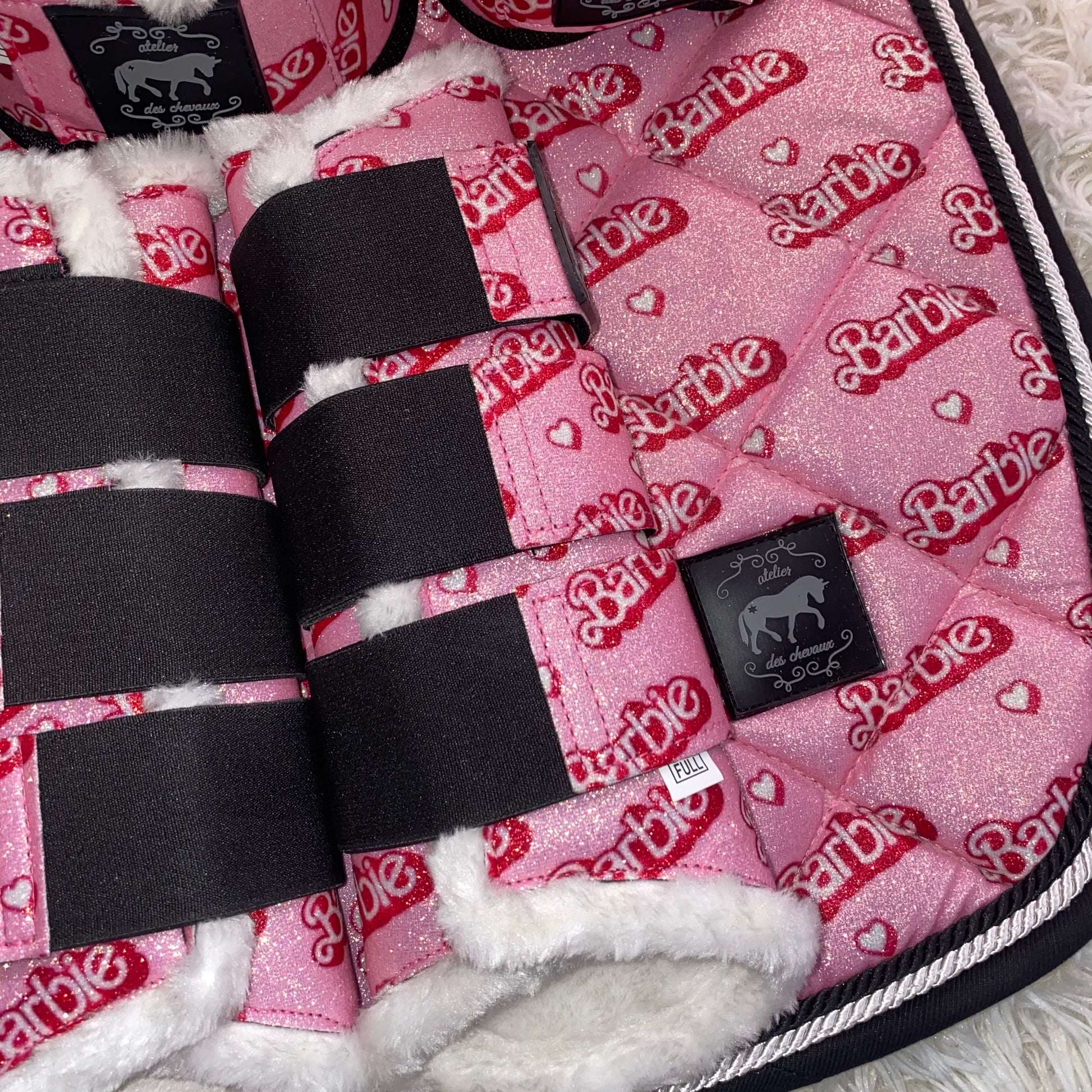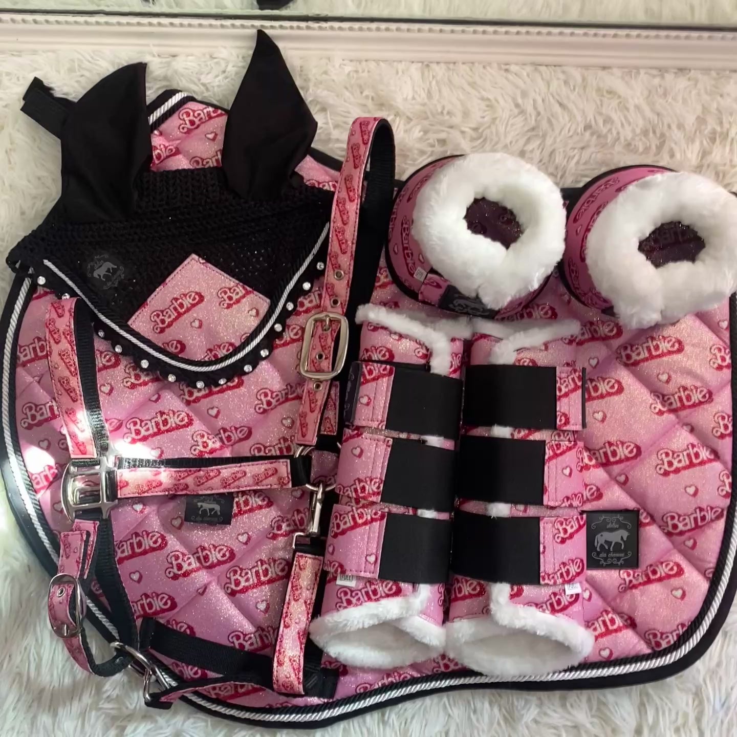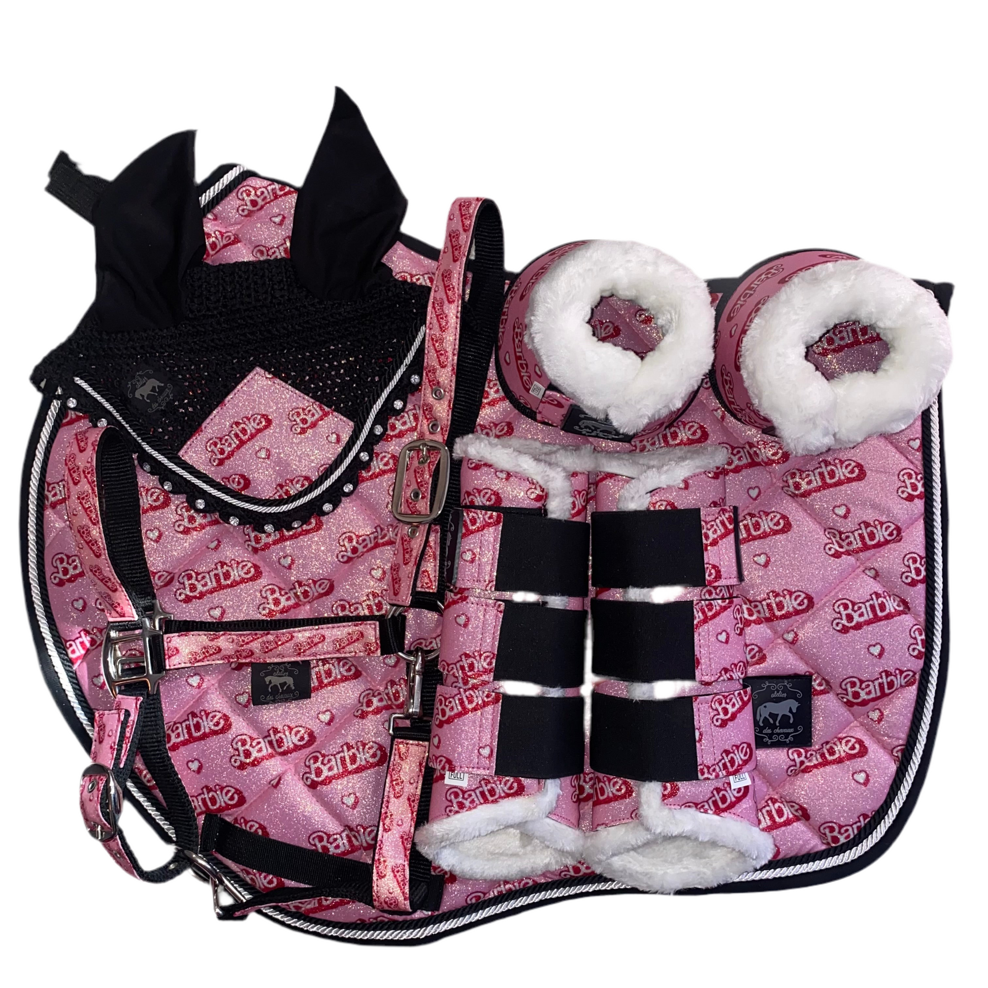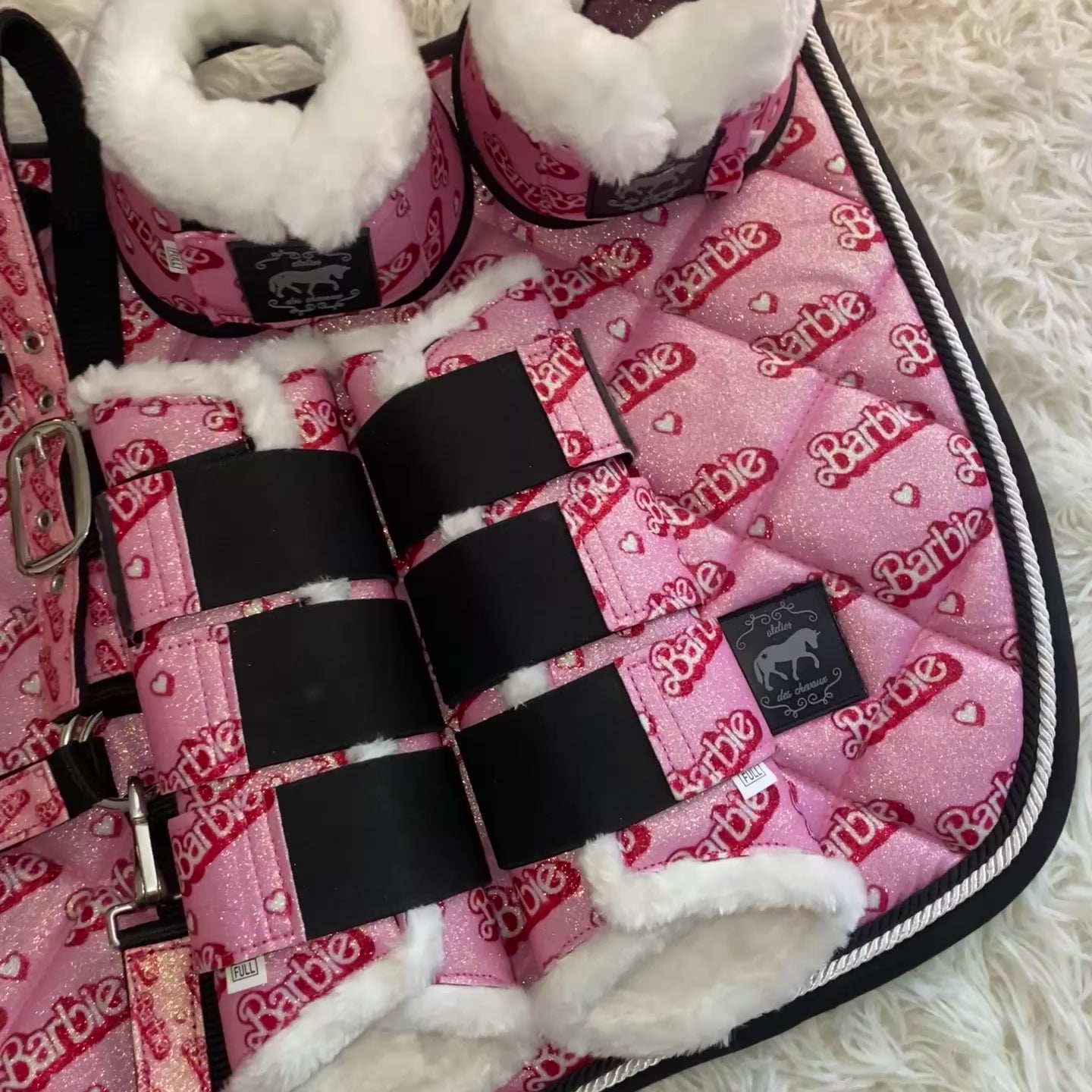 Un set elegante e luminoso, in un rosa acceso e brillante con stampa Barbie glitter, perfetto per distinguersi in sella. 😍✨