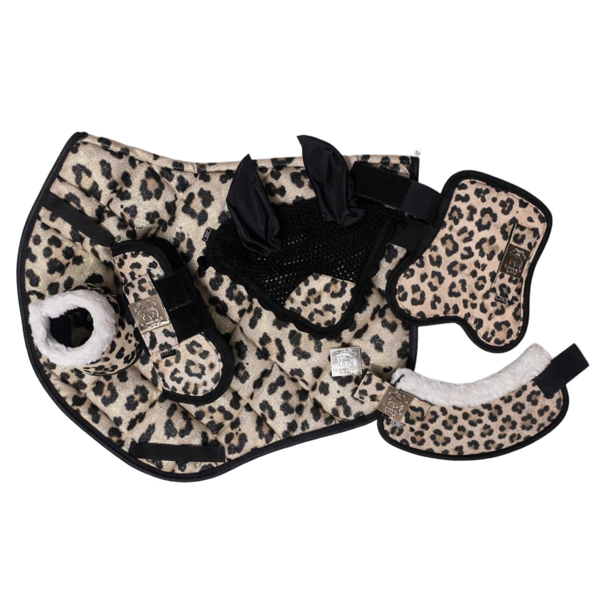 Coordinated horse set with leopard print and glitter details, for an elegant and bold style. It includes a matching bonnet, a contoured and breathable saddle pad, and matching boots and bell boots. The glitter details enhance the set, making it bright and refined.