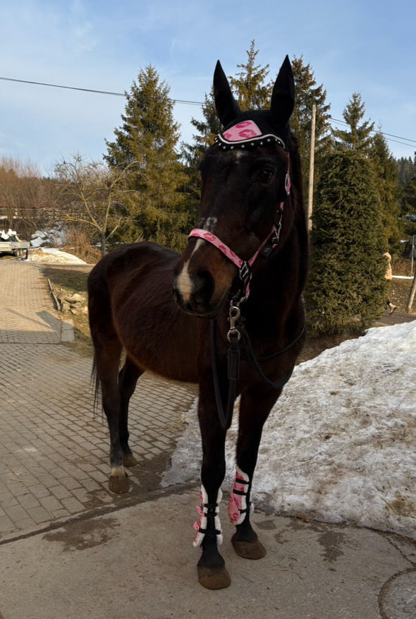 - Cavezza: Resistente e regolabile, con morbida imbottitura per il massimo comfort del cavallo e fibbie in metallo per una perfetta vestibilità.