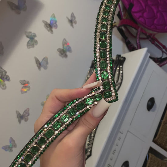Elegante frontalino a V, impreziosito da file di brillantini verdi e argento, con una riga centrale di diamanti verde chiaro più grandi per un effetto luminoso e raffinato.