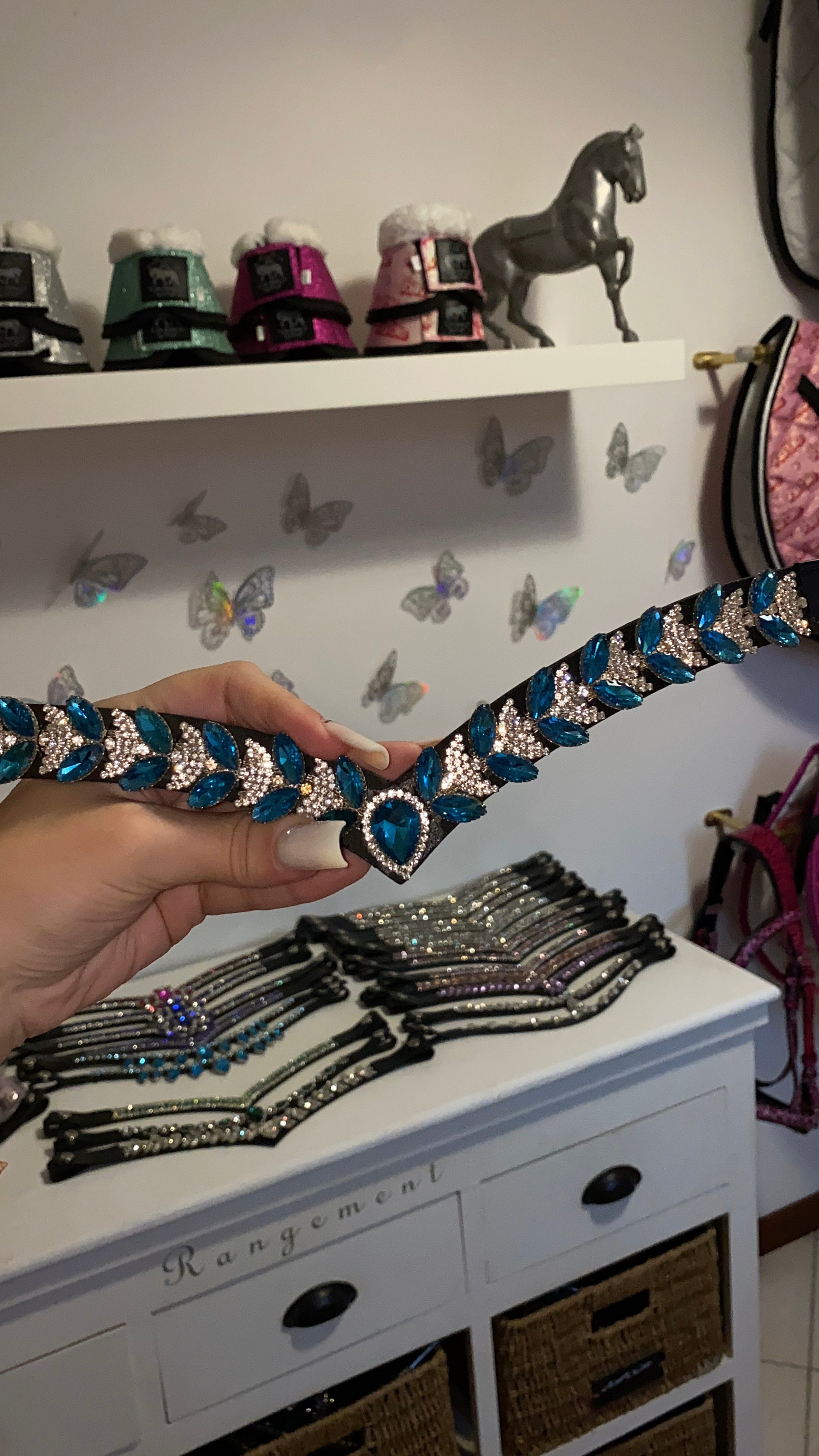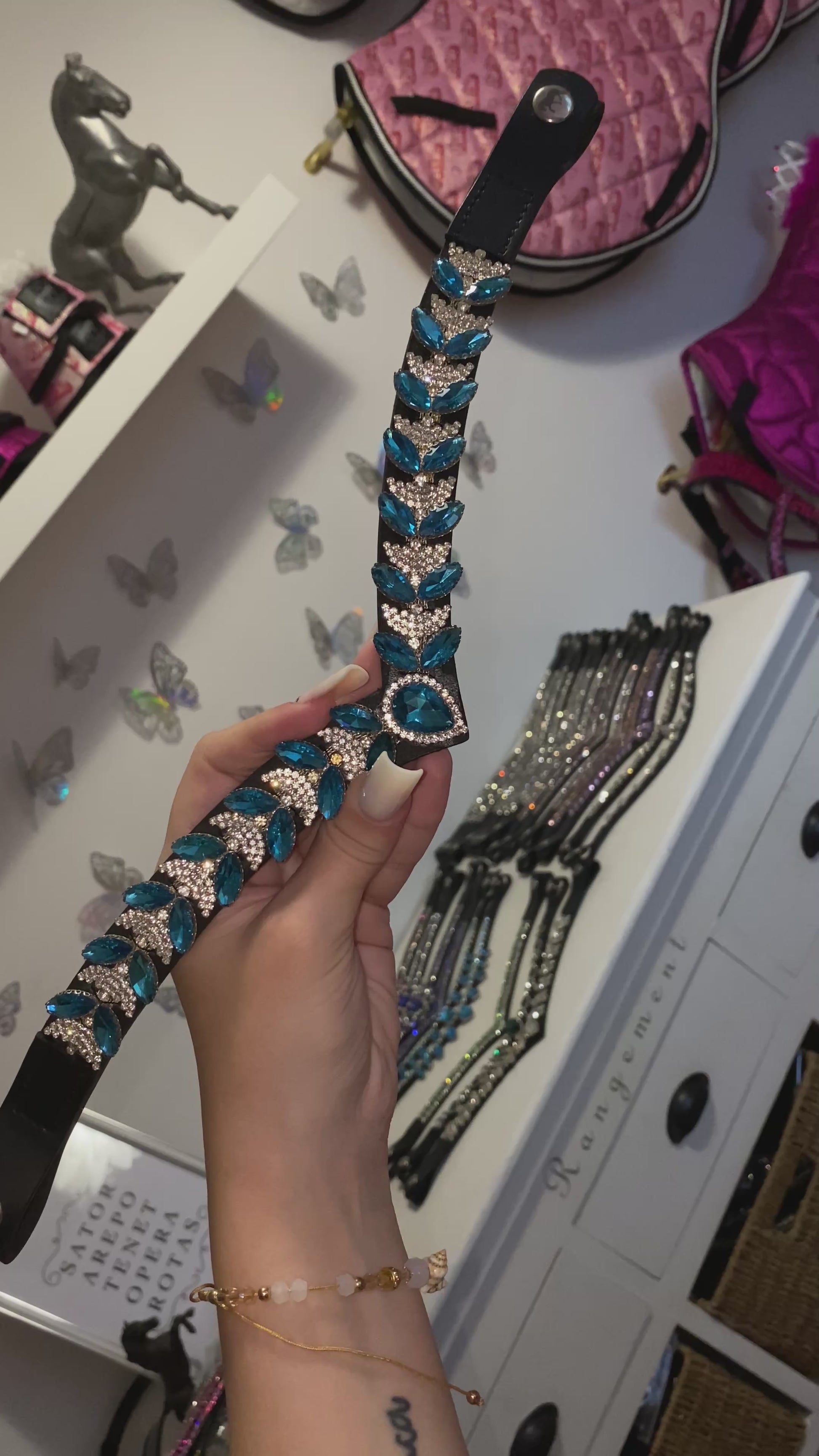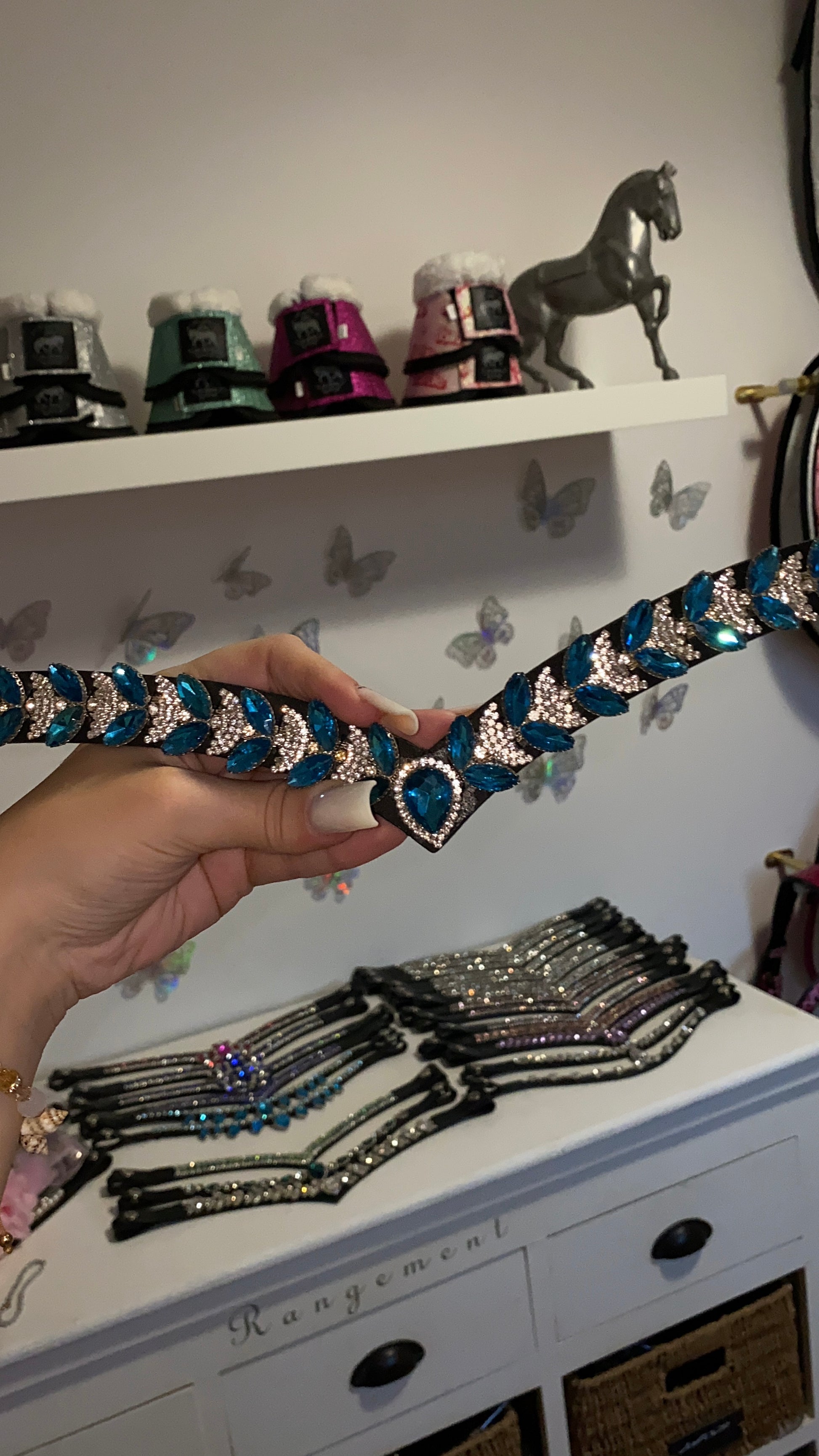 Perfetto per gare, eventi speciali o allenamenti, aggiunge un tocco di stile e luminosità alla testiera del cavallo. 🐎✨💙🩵
