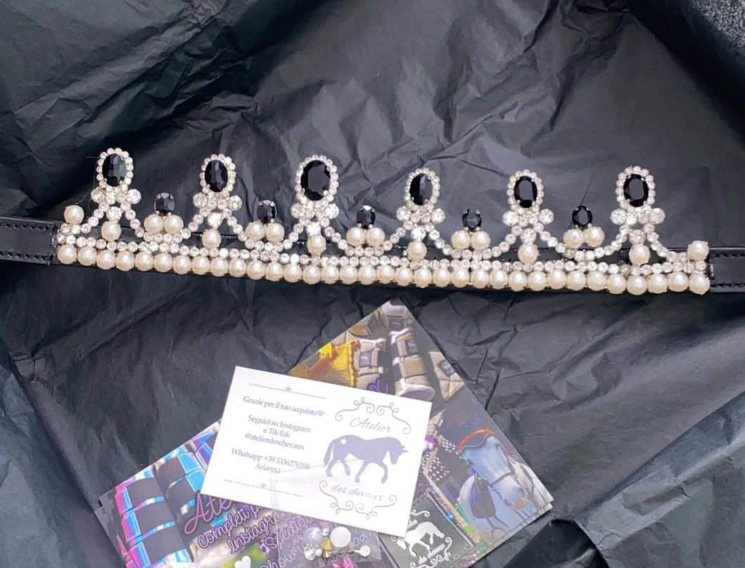I brillantini neri scintillanti creano un effetto luminoso elegante e discreto, arricchito da perline delicate che donano un tocco di classe. Ogni dettaglio è studiato per valorizzare la bellezza del cavallo con stile e personalità, perfetto per occasioni speciali e gare.