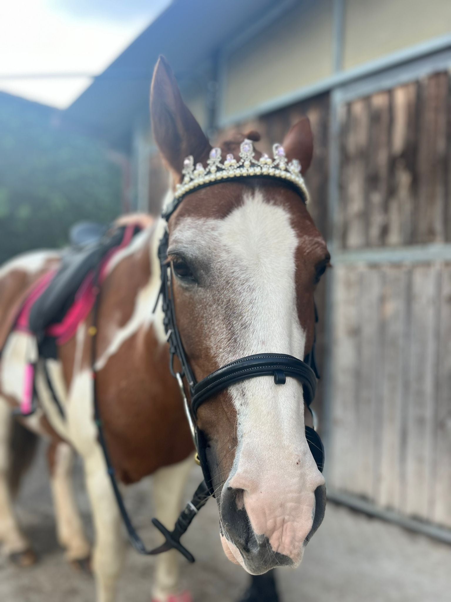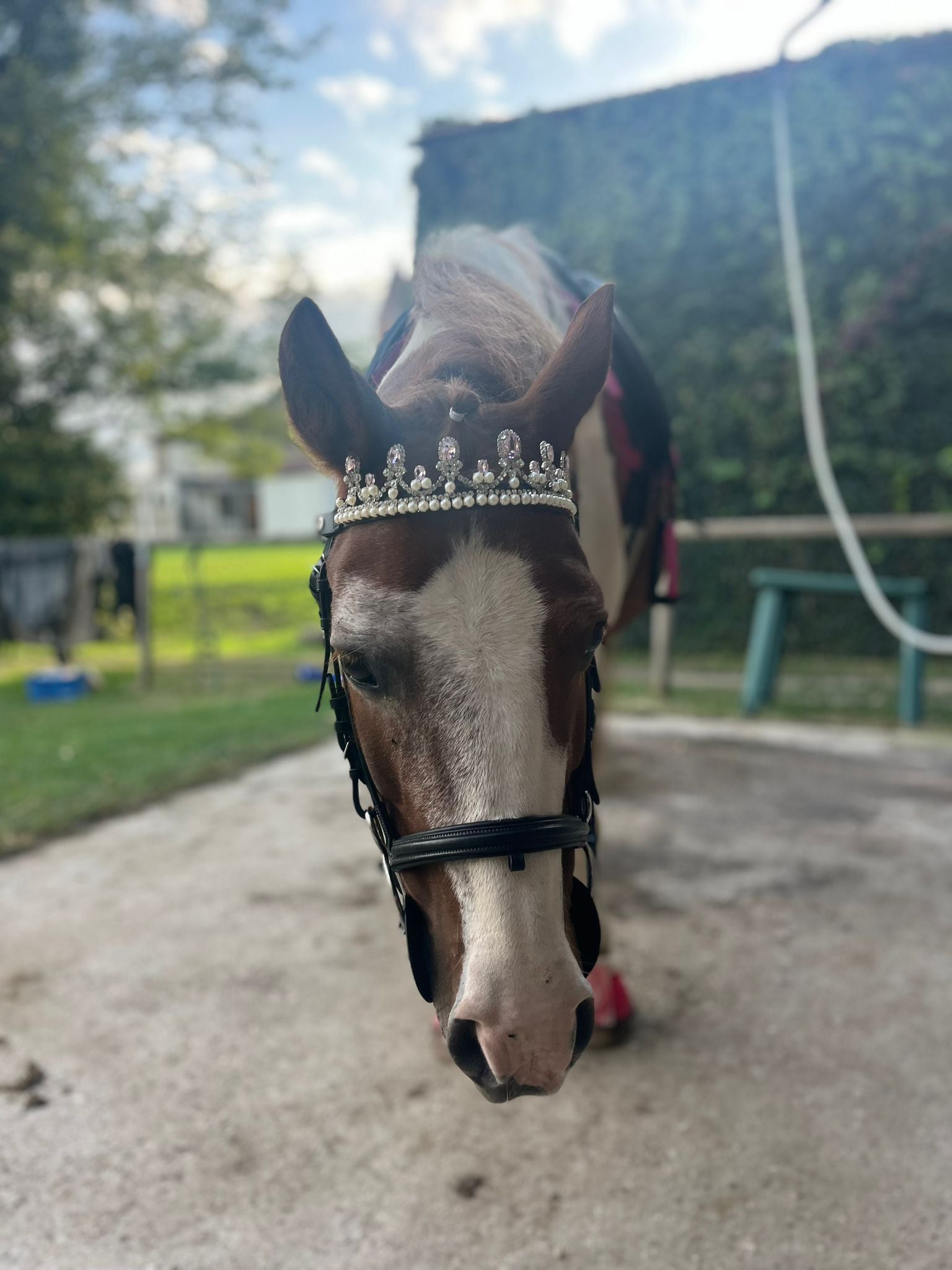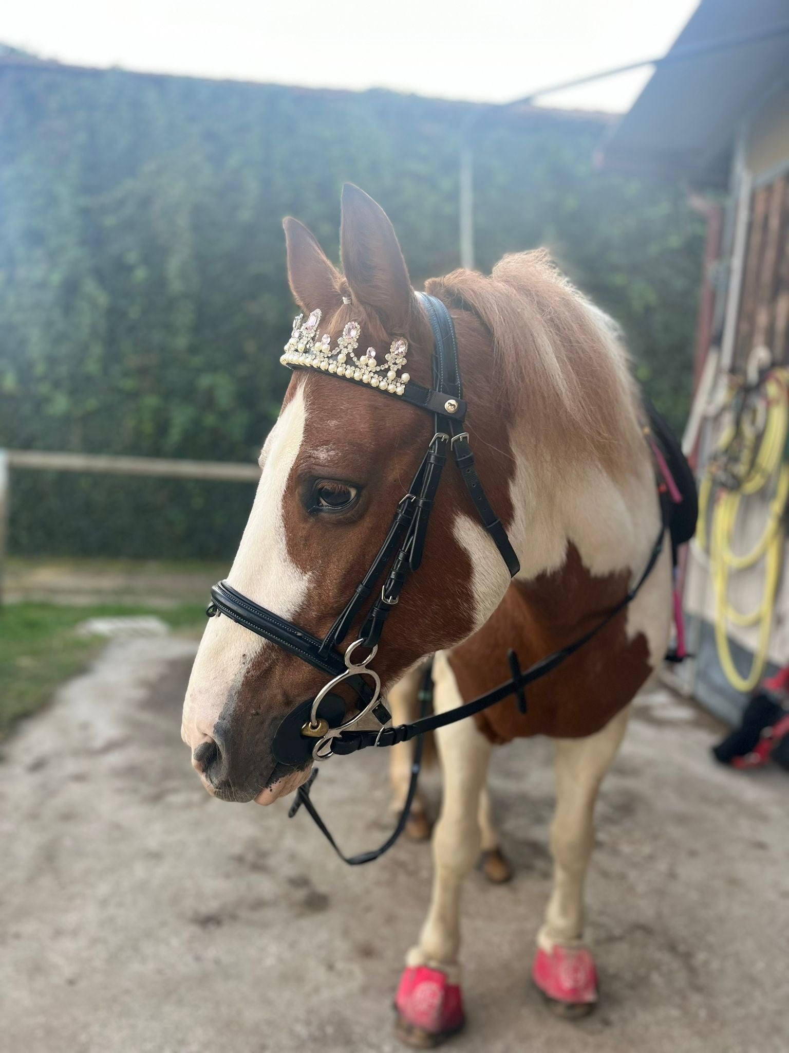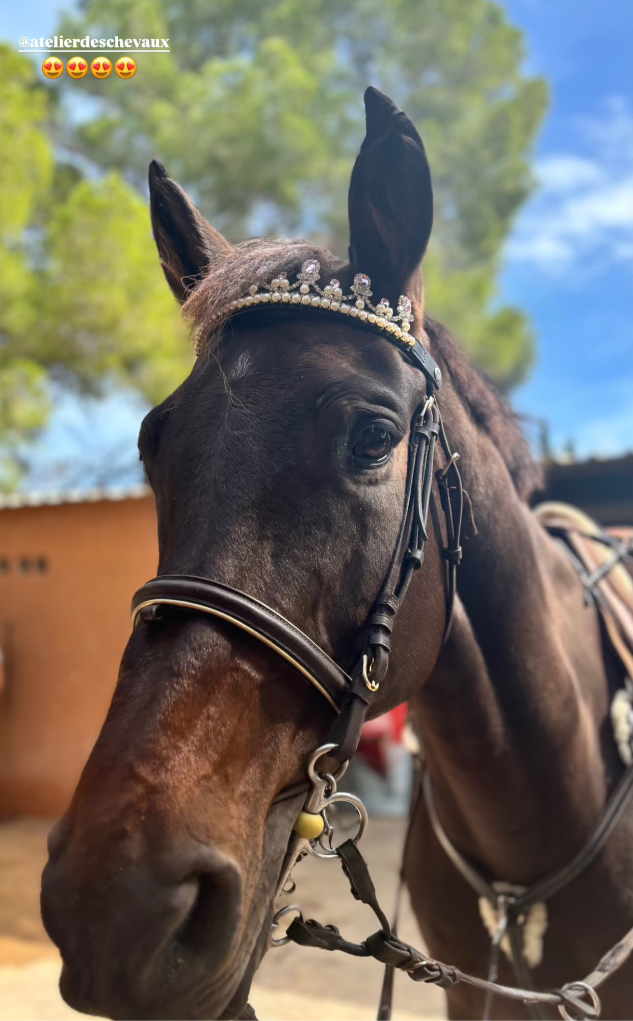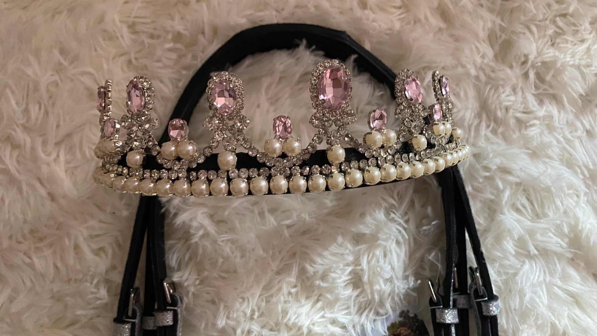 Questo frontalino in cuoio, dal design a coroncina, unisce eleganza e raffinatezza con un tocco delicato e luminoso. La base in cuoio di alta qualità garantisce resistenza e durata nel tempo, mantenendo al contempo morbidezza e comfort per il cavallo.