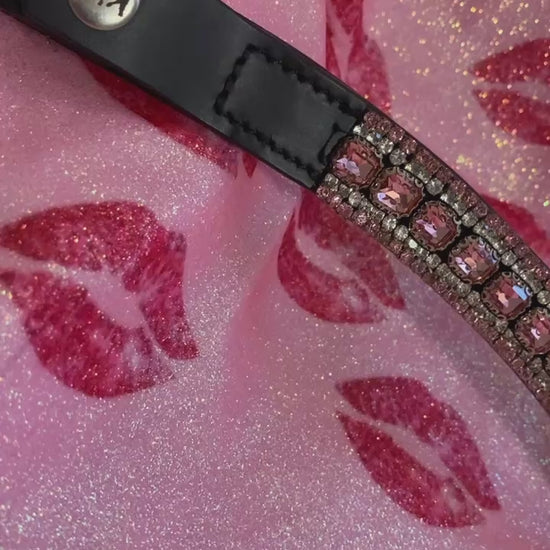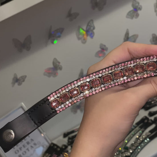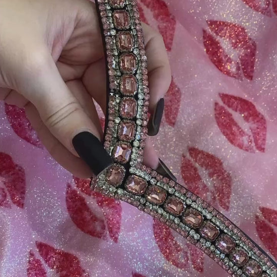 Elegante frontalino a V, impreziosito da file di brillantini rosa chiaro e argento, con una riga centrale di diamanti rosa chiaro più grandi per un effetto luminoso e raffinato.