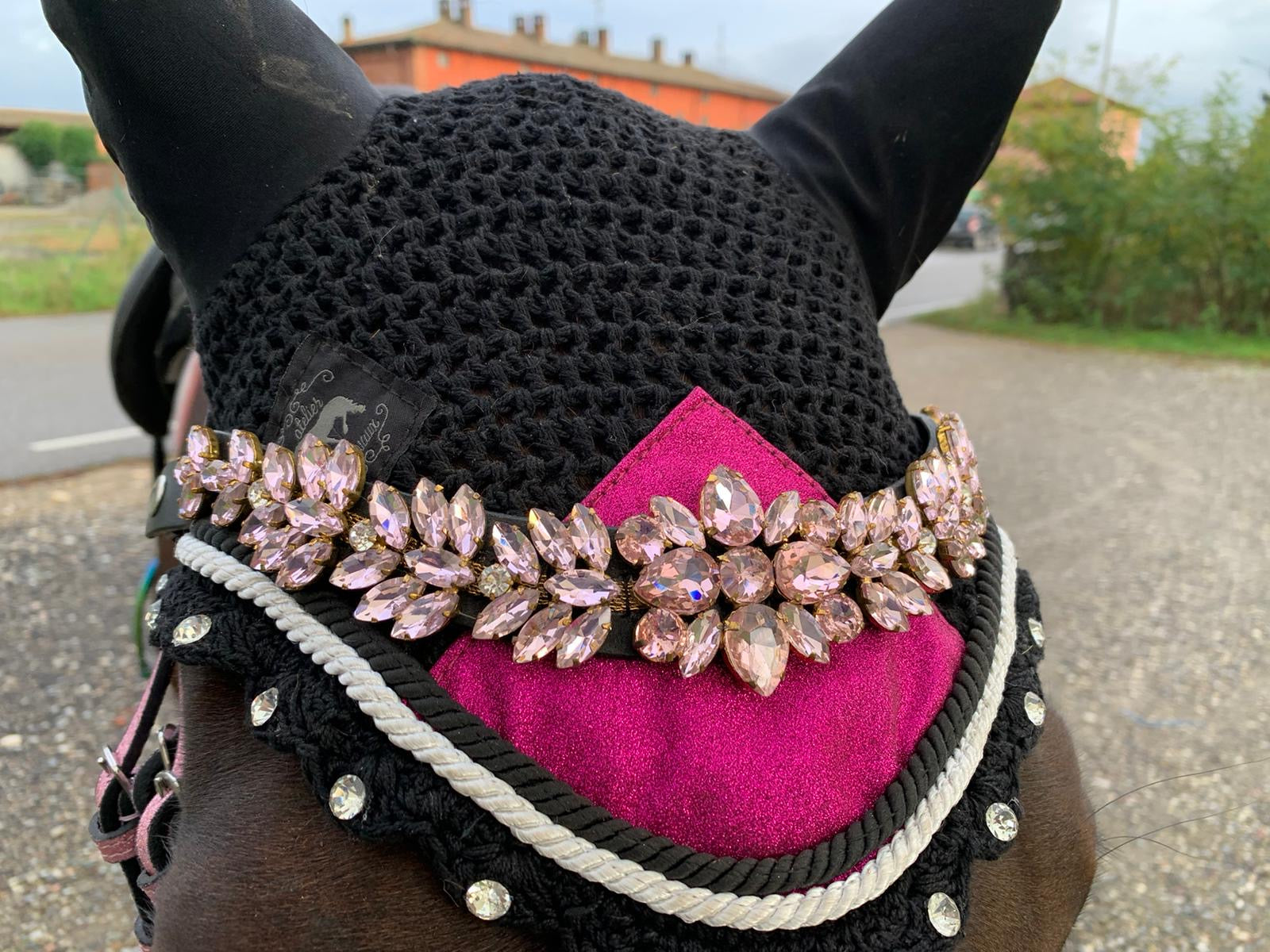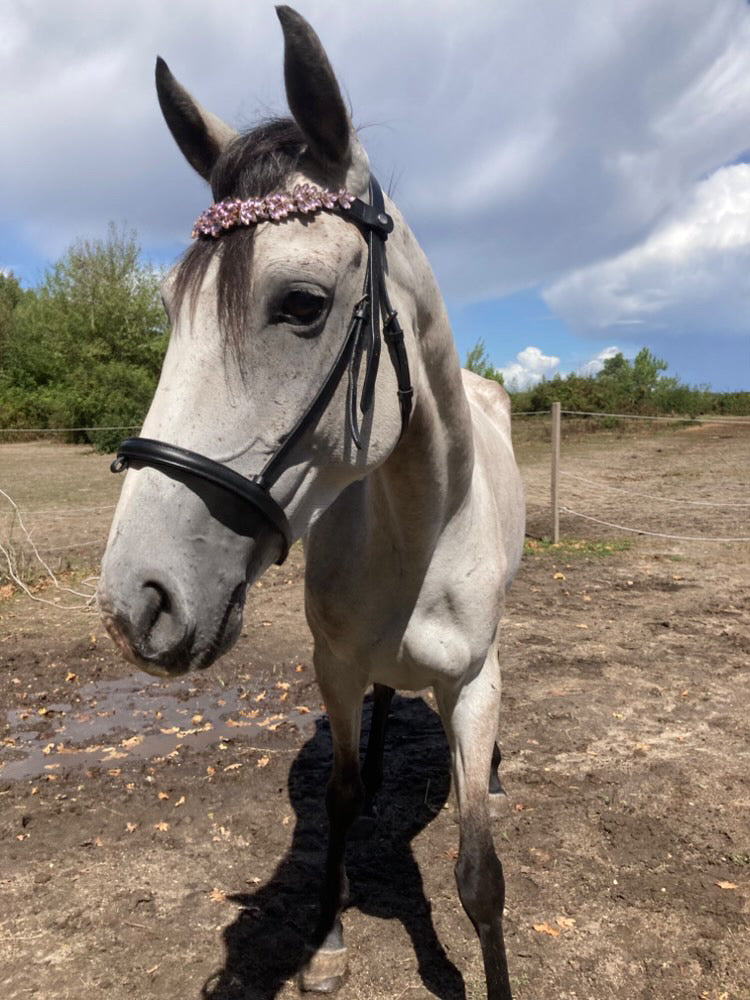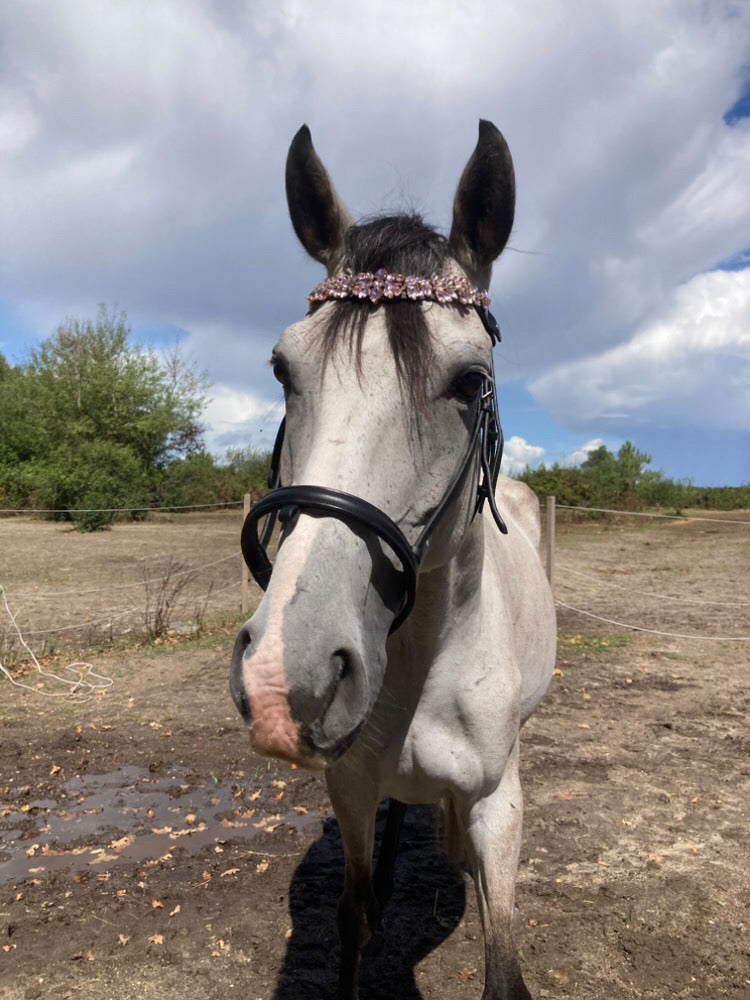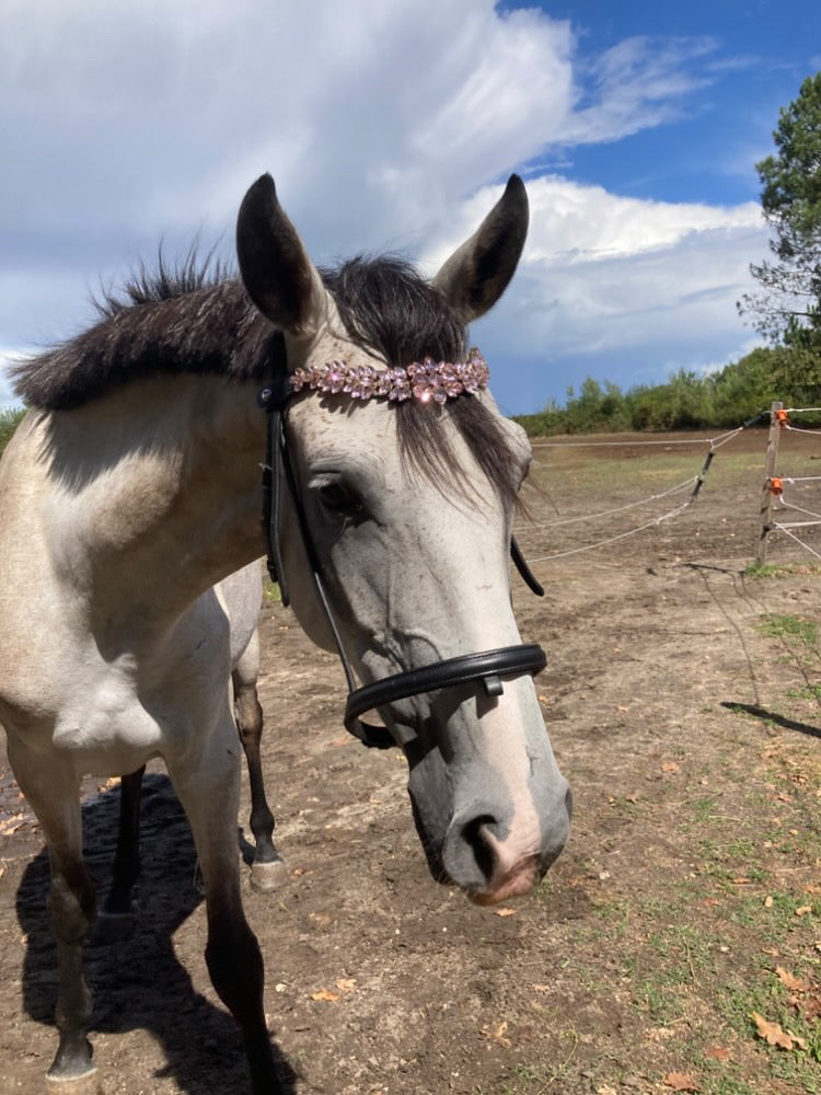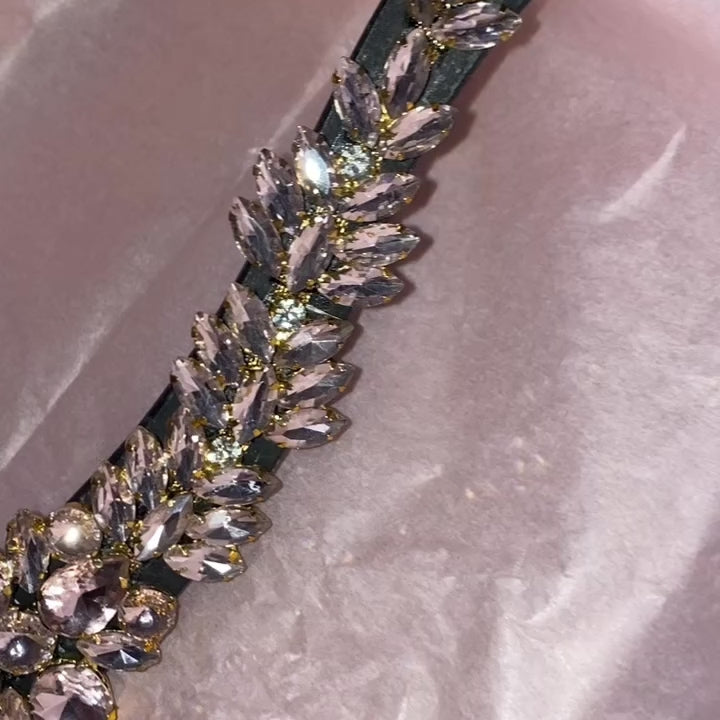 La sua forma a U, pensata per valorizzare la linea del capo, è arricchita da una splendida catena di cristalli rosa chiaro, cucita con precisione sul cuoio per garantire resistenza e stabilità. Ogni cristallo è posizionato per catturare e riflettere la luce, creando un effetto scintillante e sofisticato.