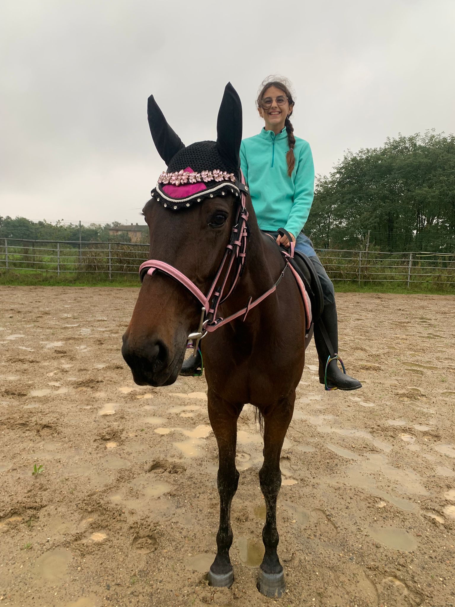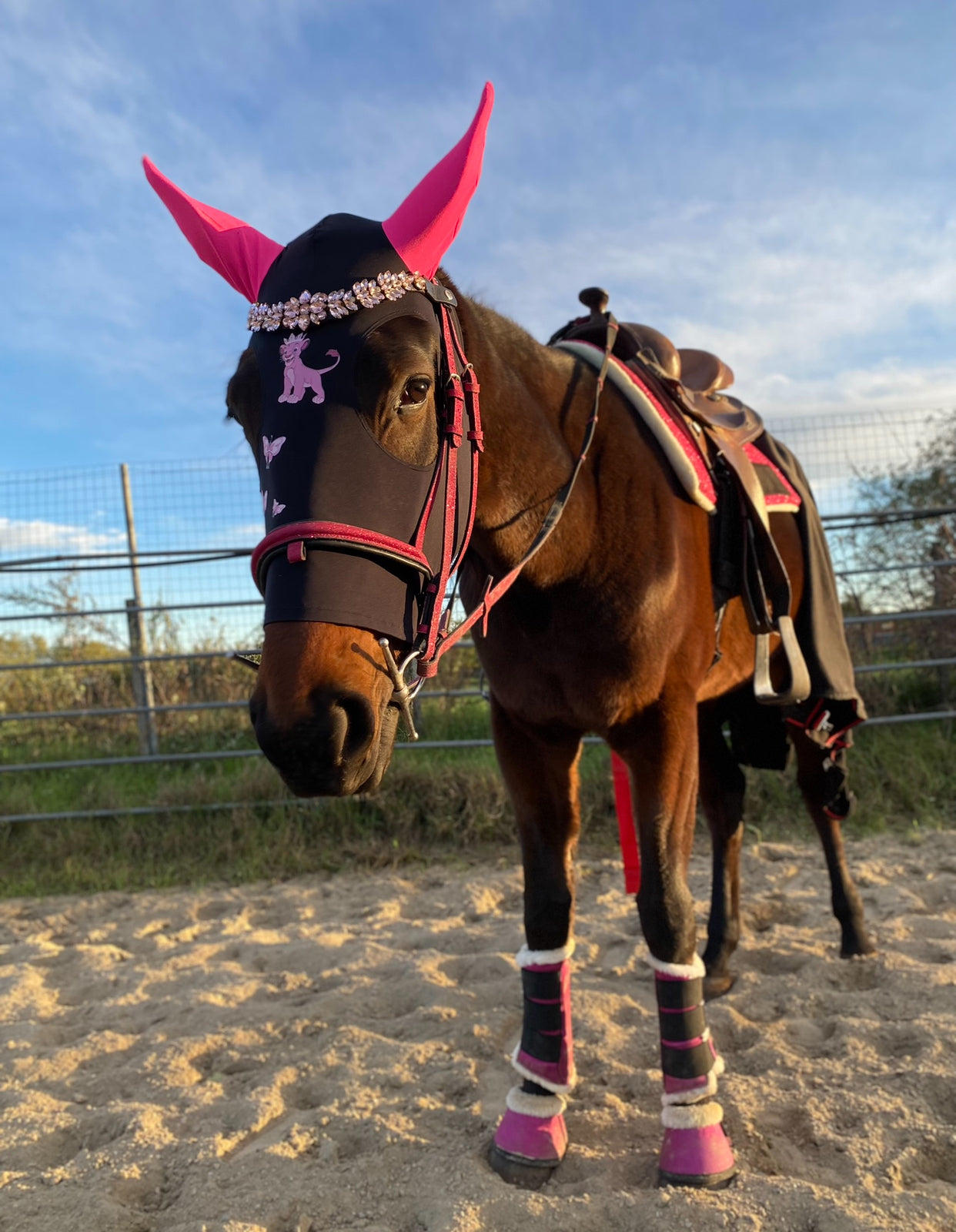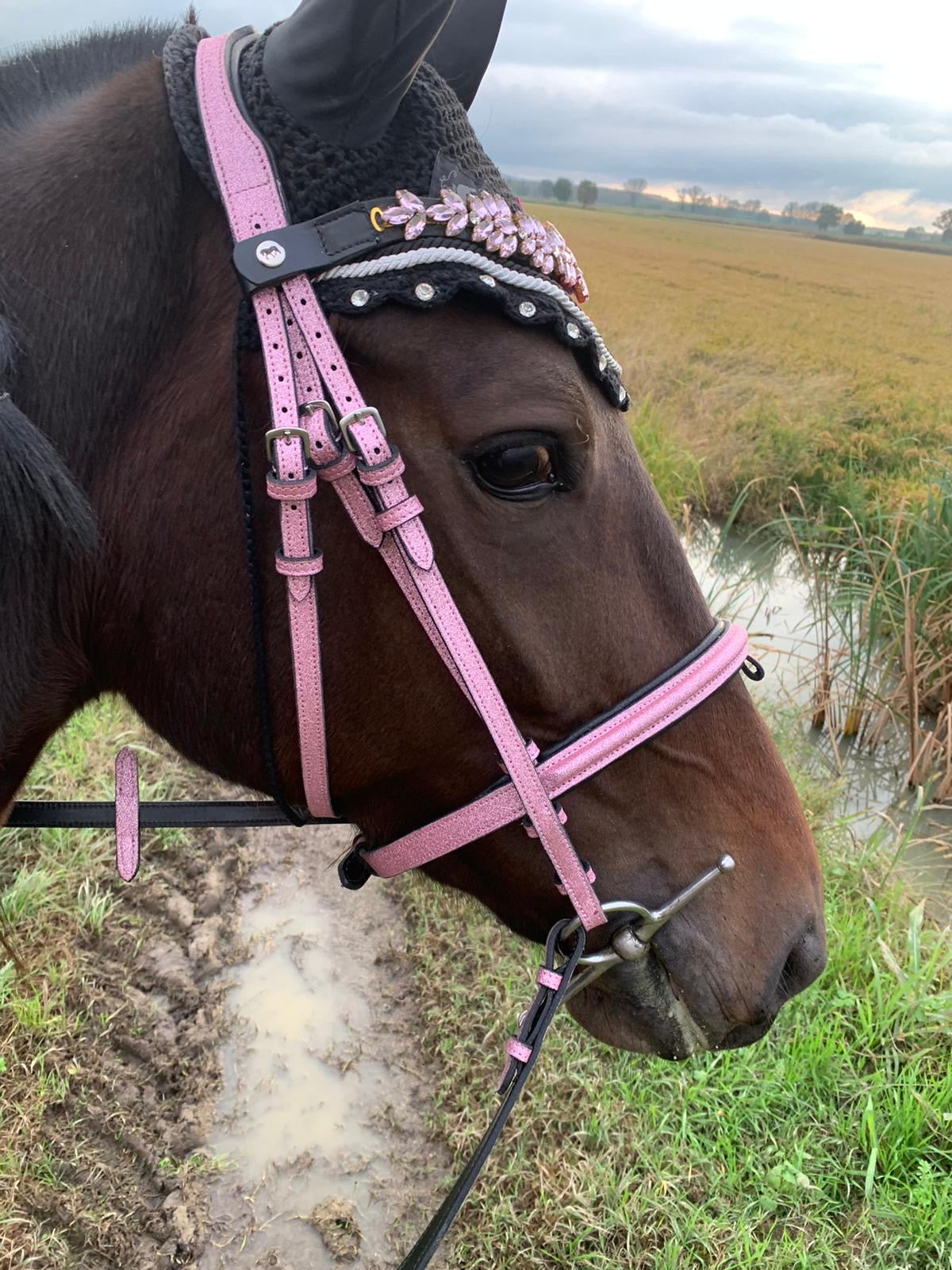 La sua forma a U, pensata per valorizzare la linea del capo, è arricchita da una splendida catena di cristalli rosa chiaro, cucita con precisione sul cuoio per garantire resistenza e stabilità. Ogni cristallo è posizionato per catturare e riflettere la luce, creando un effetto scintillante e sofisticato.