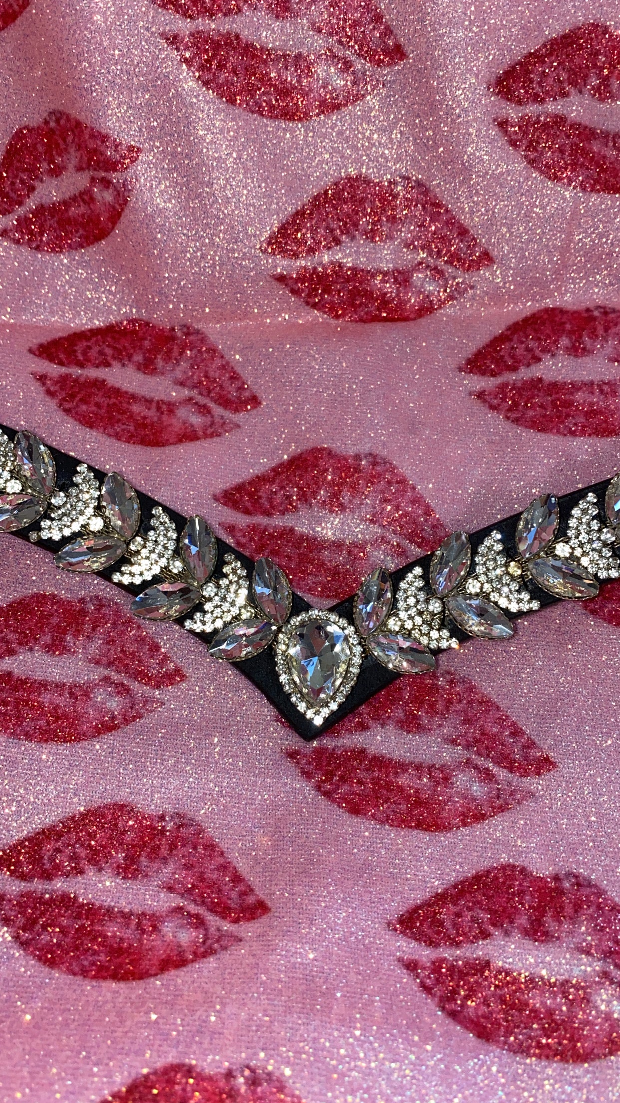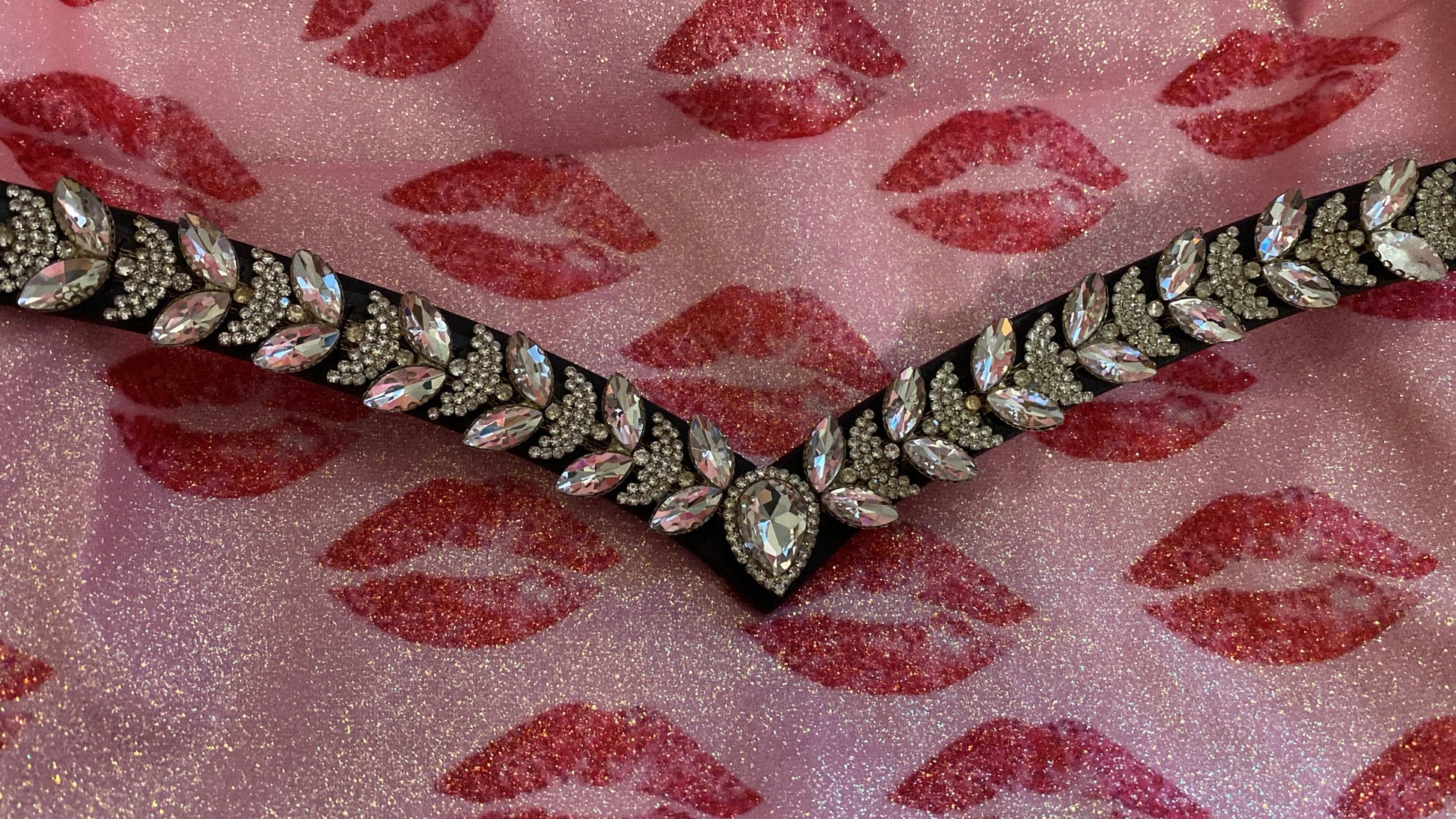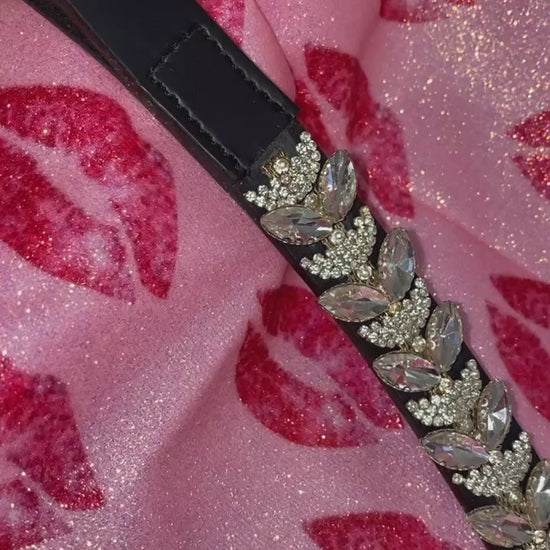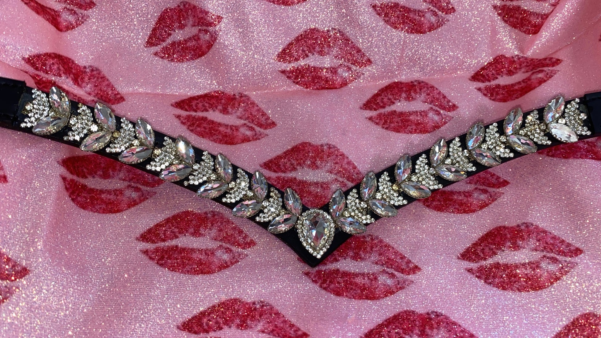 Elegante frontalino a V, impreziosito da un diamante centrale e da brillantini argento di diverse dimensioni (grandi e piccoli) che creano un motivo scintillante e raffinato.