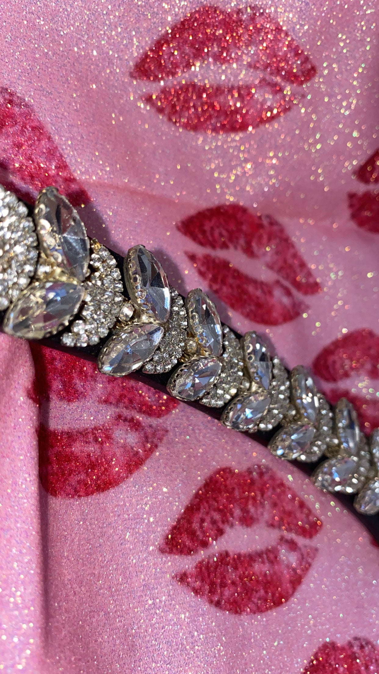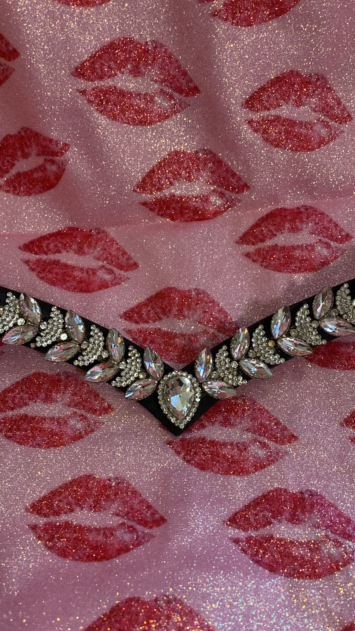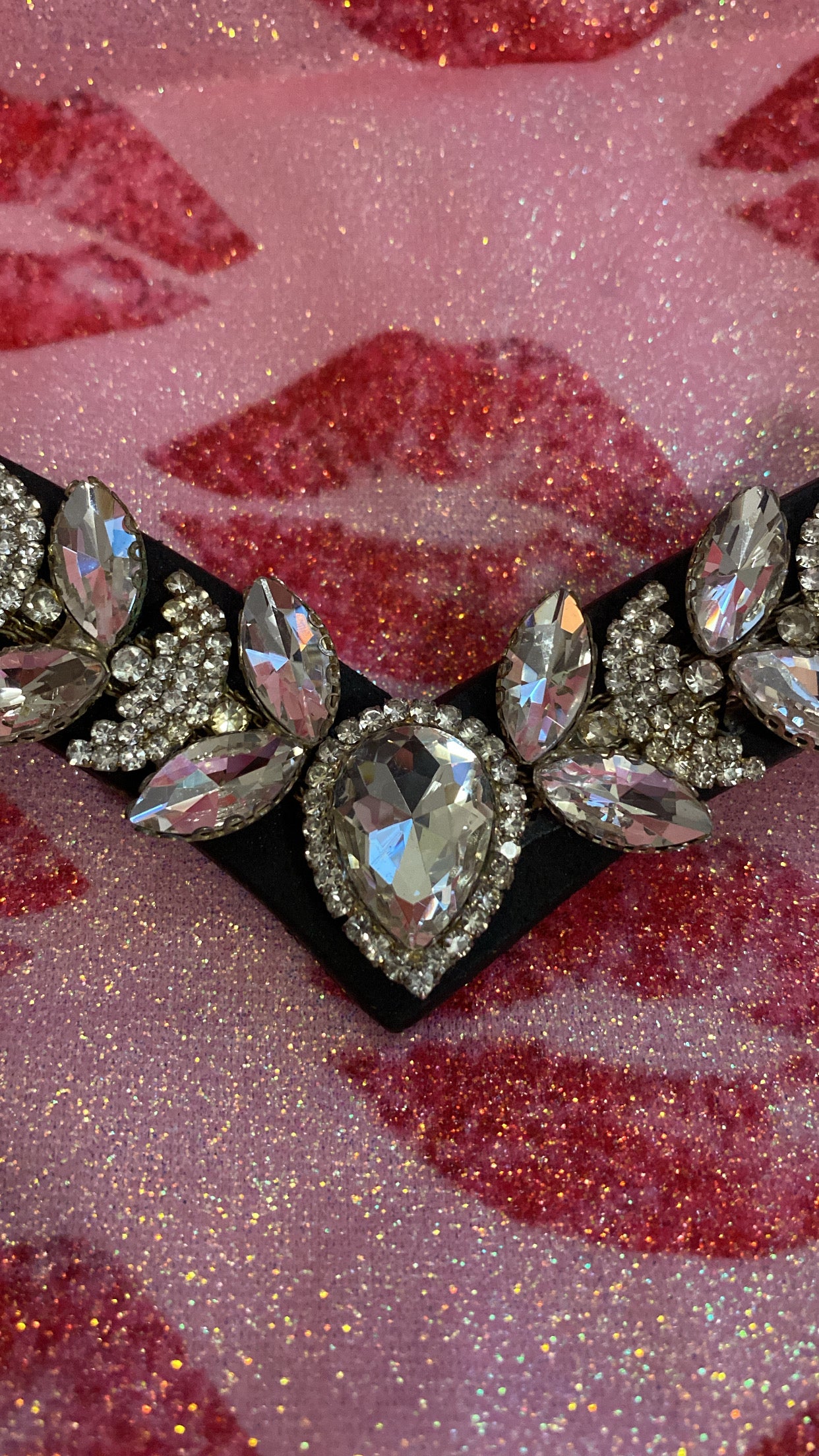 Elegante frontalino a V, impreziosito da un diamante centrale e da brillantini argento di diverse dimensioni (grandi e piccoli) che creano un motivo scintillante e raffinato.