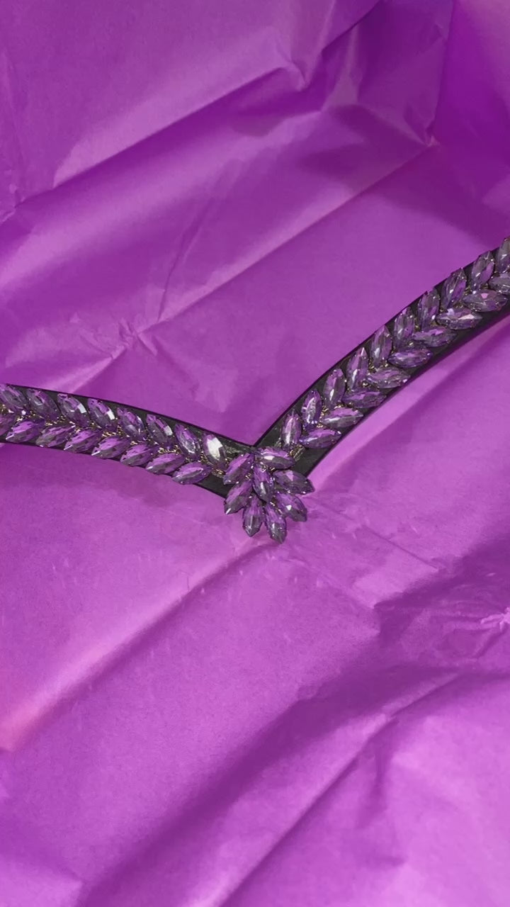 Il frontalino Royal Violet è un vero gioiello per il tuo cavallo. Il design a V, raffinato ed elegante, esalta la forma del capo, donando un tocco di regalità e imponenza. La fila di cristalli viola scintillanti, accuratamente incastonati, crea un effetto luminoso e sofisticato, mentre la disposizione a foglia intrecciata culmina in un dettaglio centrale ancora più prezioso.