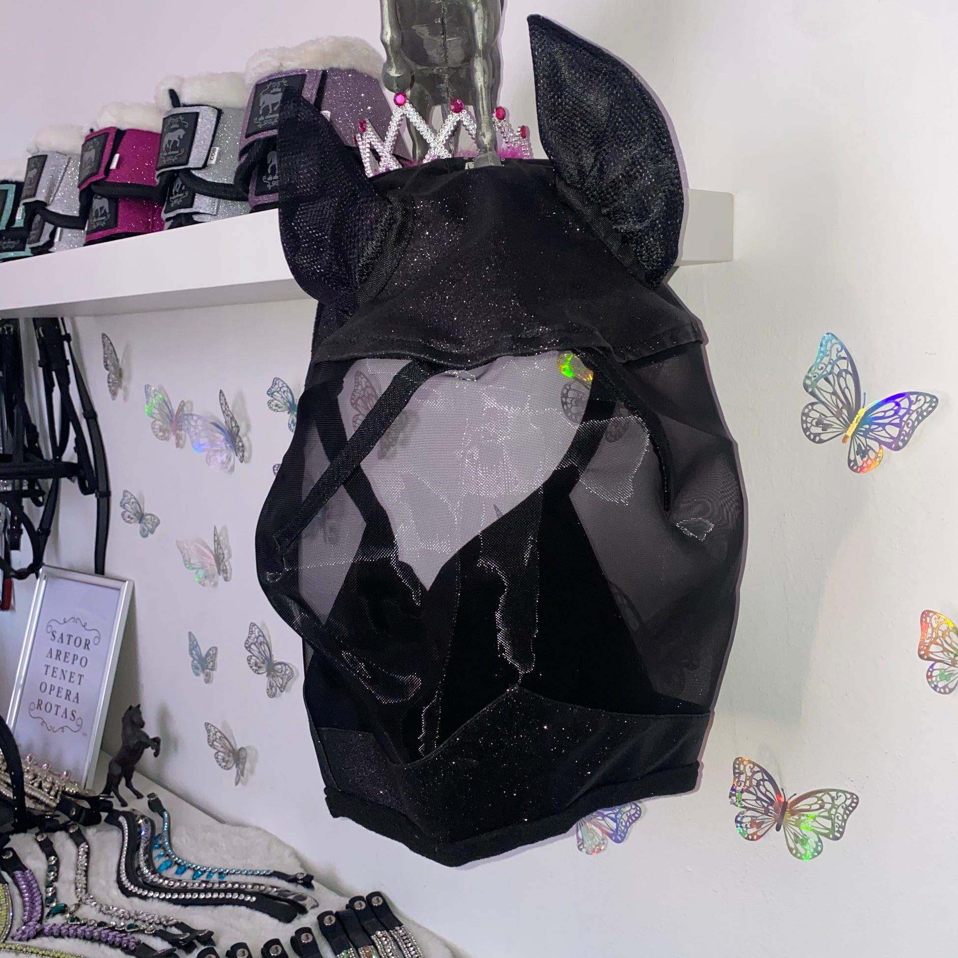 ✨ Cuffietta antimosche in rete e tessuto glitterato nero, pensata per garantire protezione dagli insetti durante l’estate senza rinunciare all’eleganza. Il colore nero unito all’effetto brillante dona al tuo cavallo un look deciso, raffinato e sempre impeccabile, sia in campo che durante le uscite.