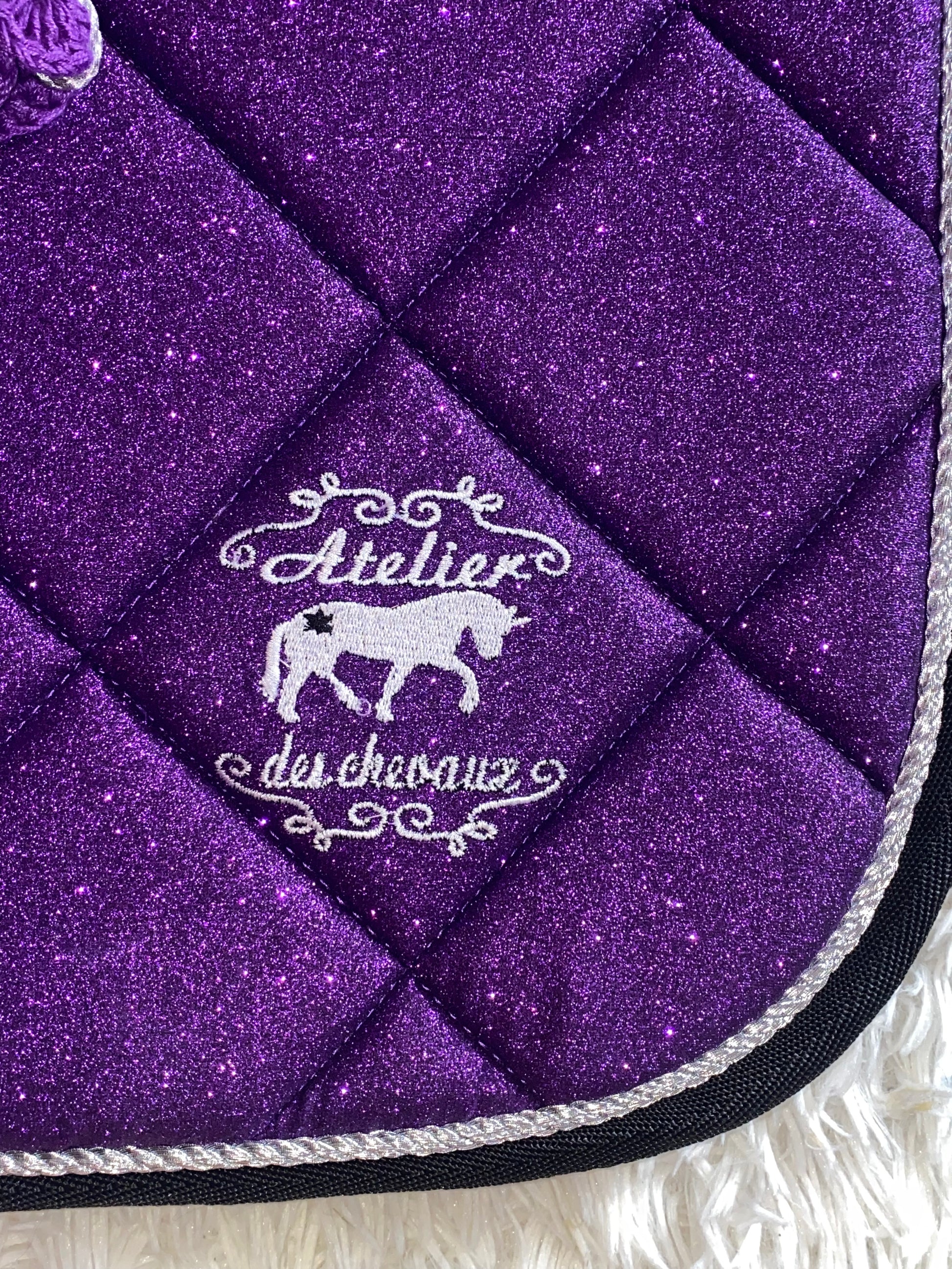 Fai risplendere ogni movimento con il nostro set viola glitter da dressage! Sottosella morbido e cuffietta elegante proteggono il tuo cavallo con stile, mentre il glitter cattura tutti gli sguardi. Allenamenti, competizioni o spettacoli: comfort e raffinatezza sempre al passo con la tua eleganza in sella.😍
