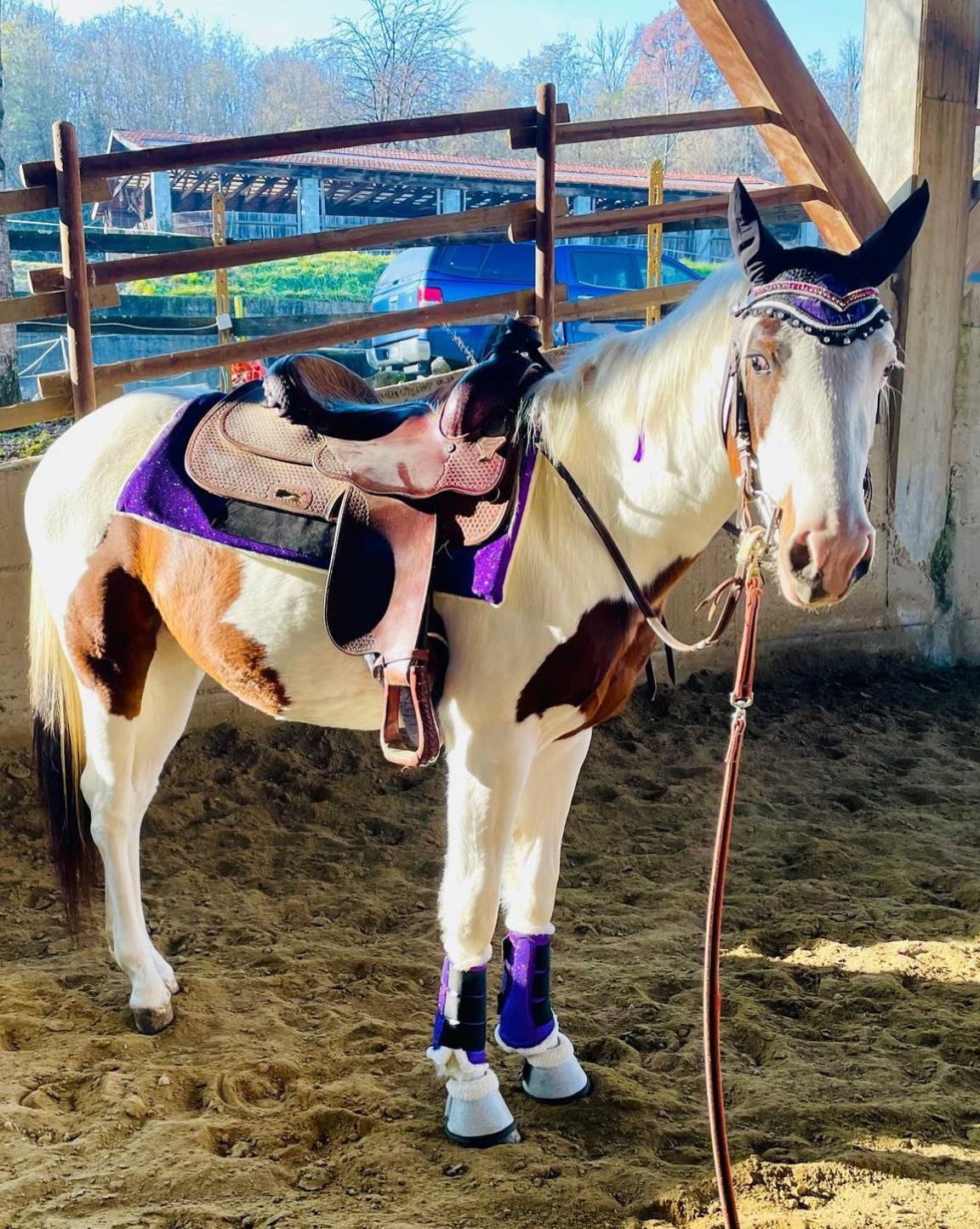 Eleva lo stile del tuo cavallo con il sottosella americano glitter, perfetto per chi desidera un look scintillante senza rinunciare al comfort. Con le sue dimensioni di 81x86 cm, è spesso e soffice, offrendo massima protezione e ammortizzazione per il dorso del cavallo.