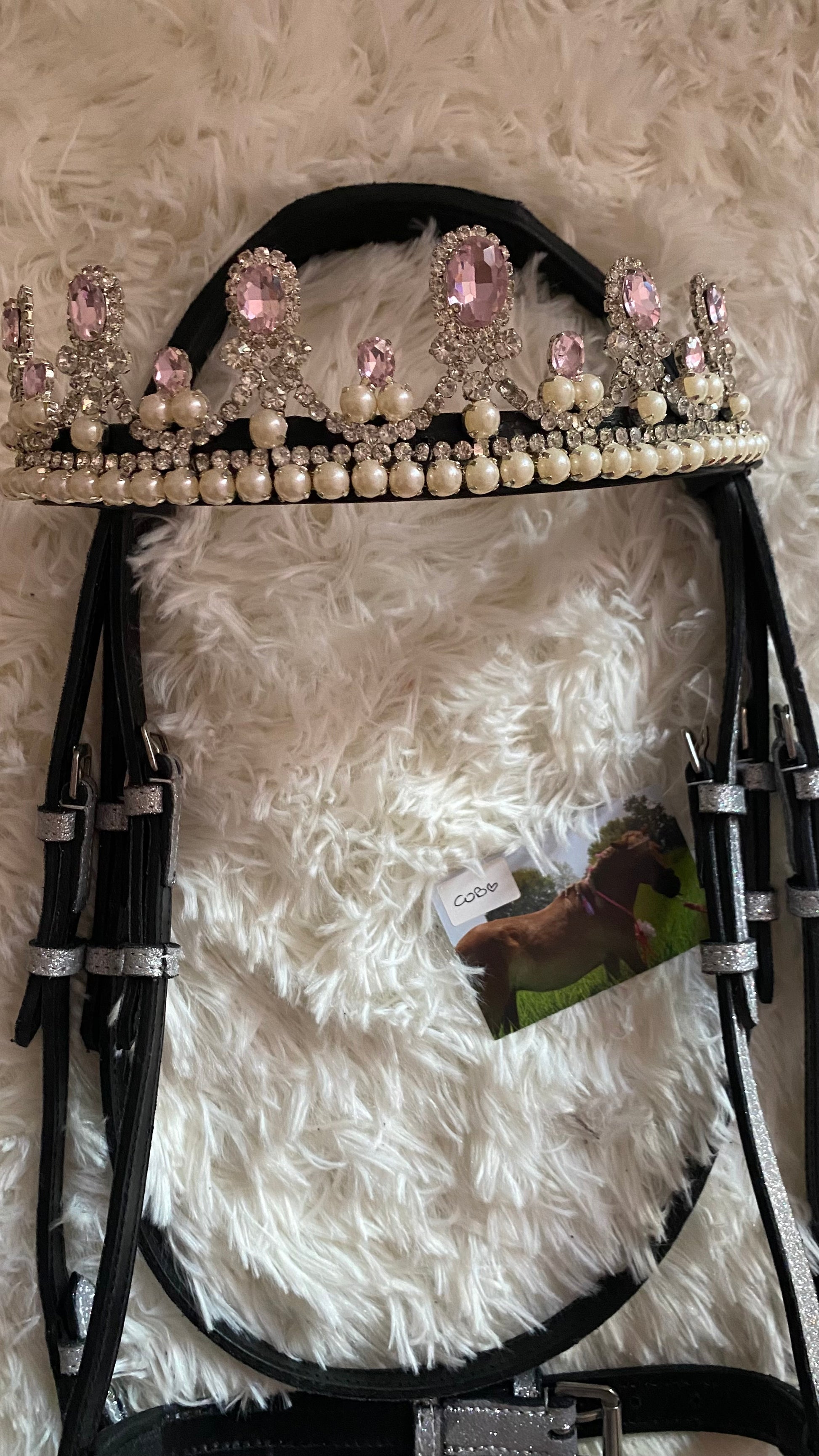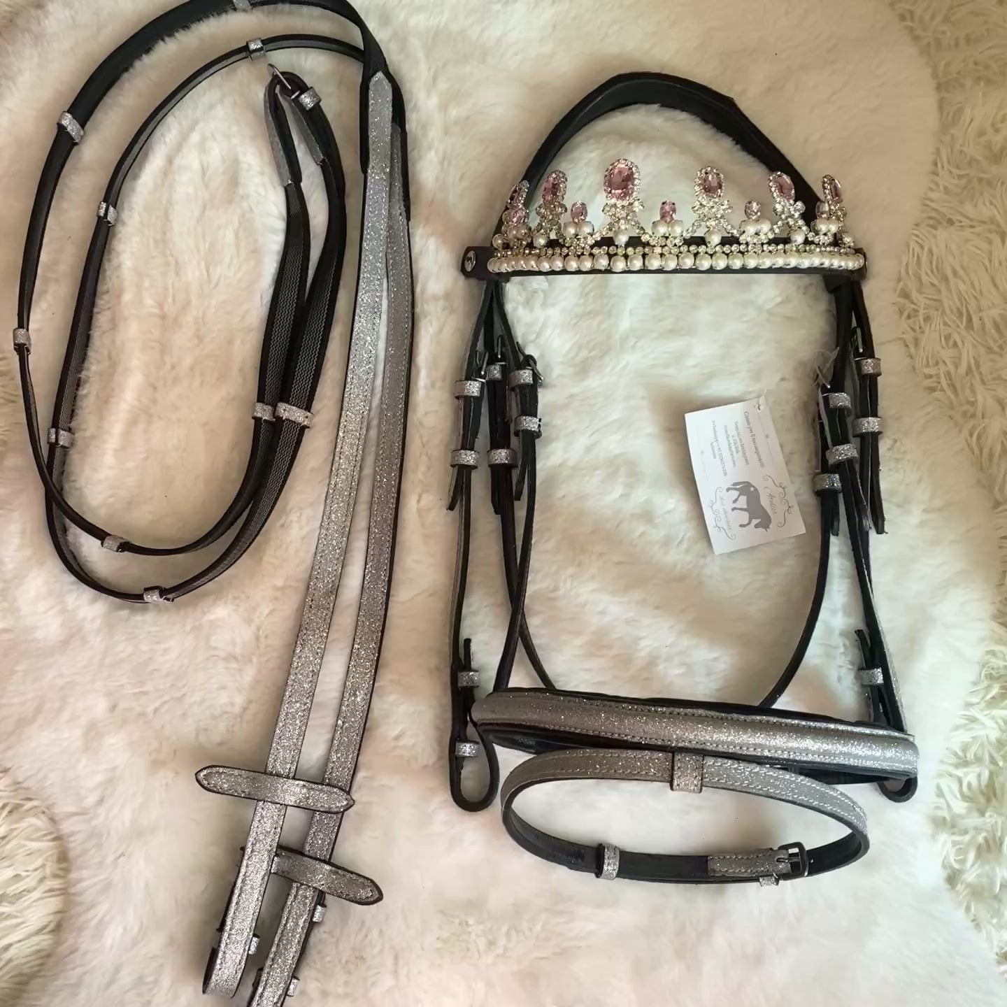 La testiera 'Silver Star' è l'accessorio ideale per chi vuole unire praticità e glamour regale. Le redini in gomma glitter argento non solo offrono una presa sicura, ma aggiungono anche un tocco di magia ad ogni movimento. Il frontalino a coroncina rosa corona letteralmente il look, trasformando ogni cavalcata in un'esperienza regale.