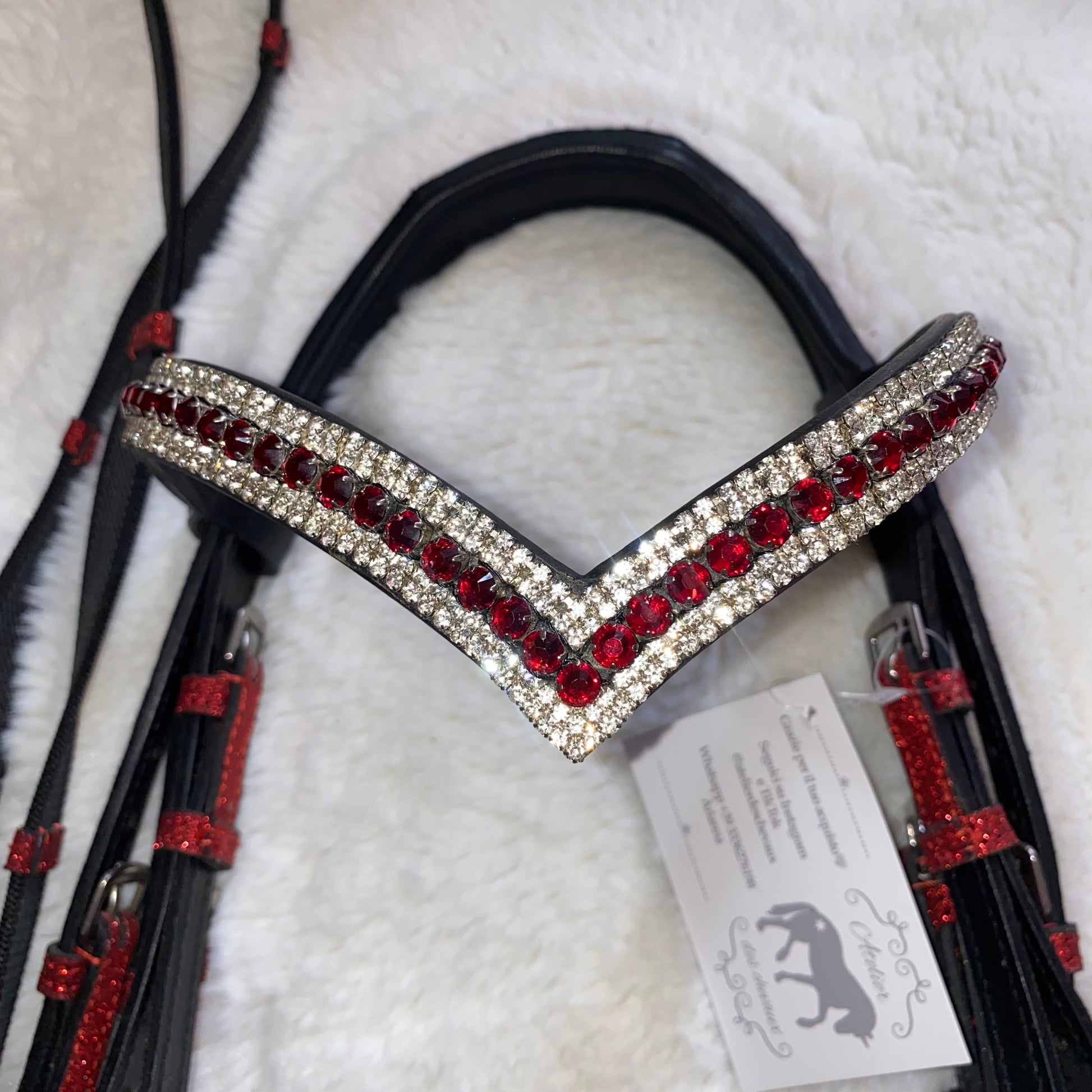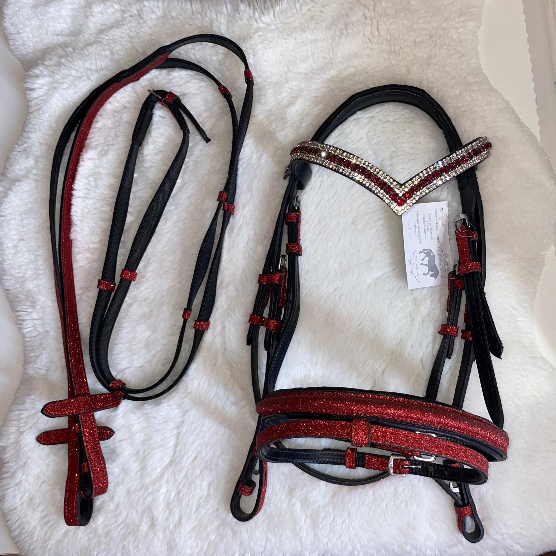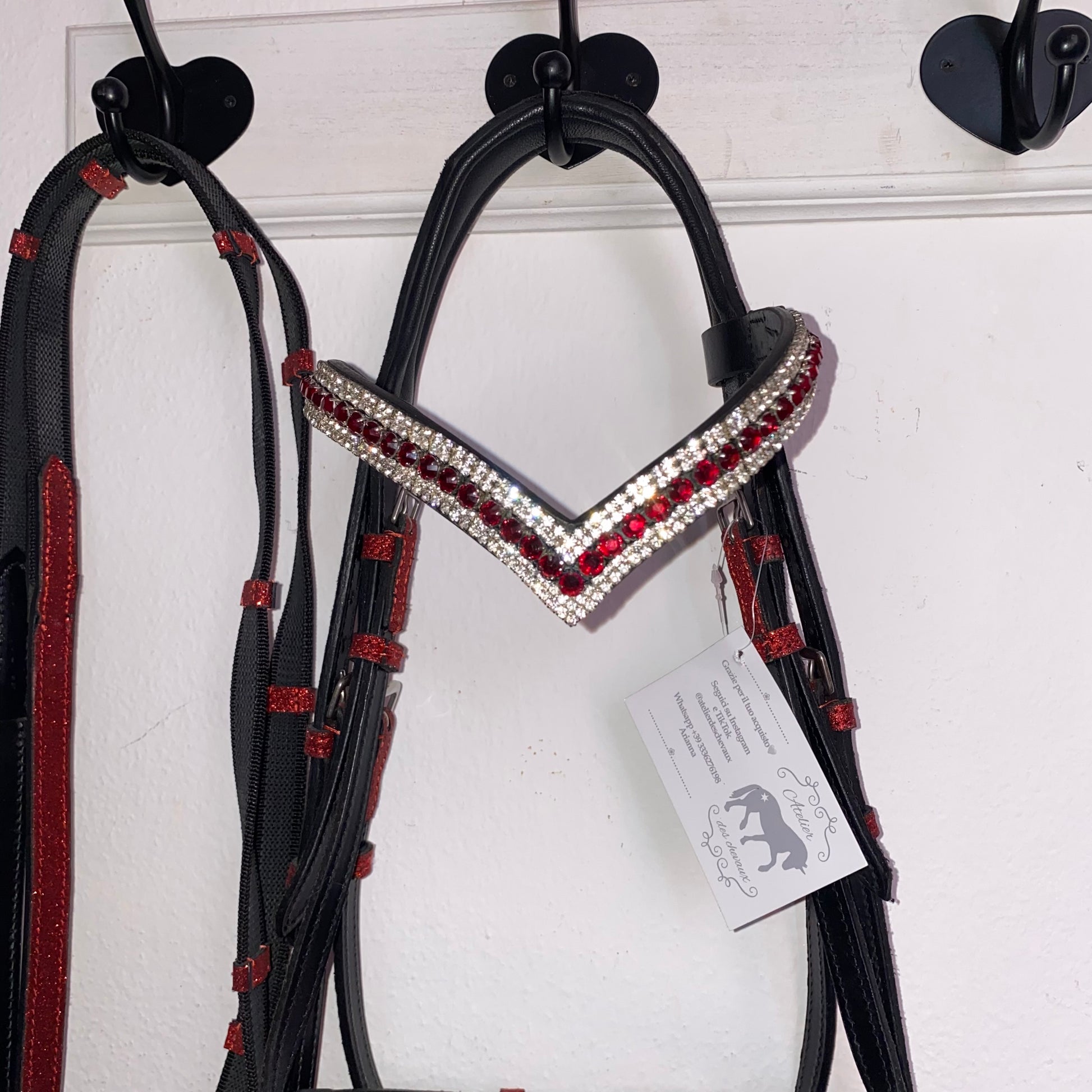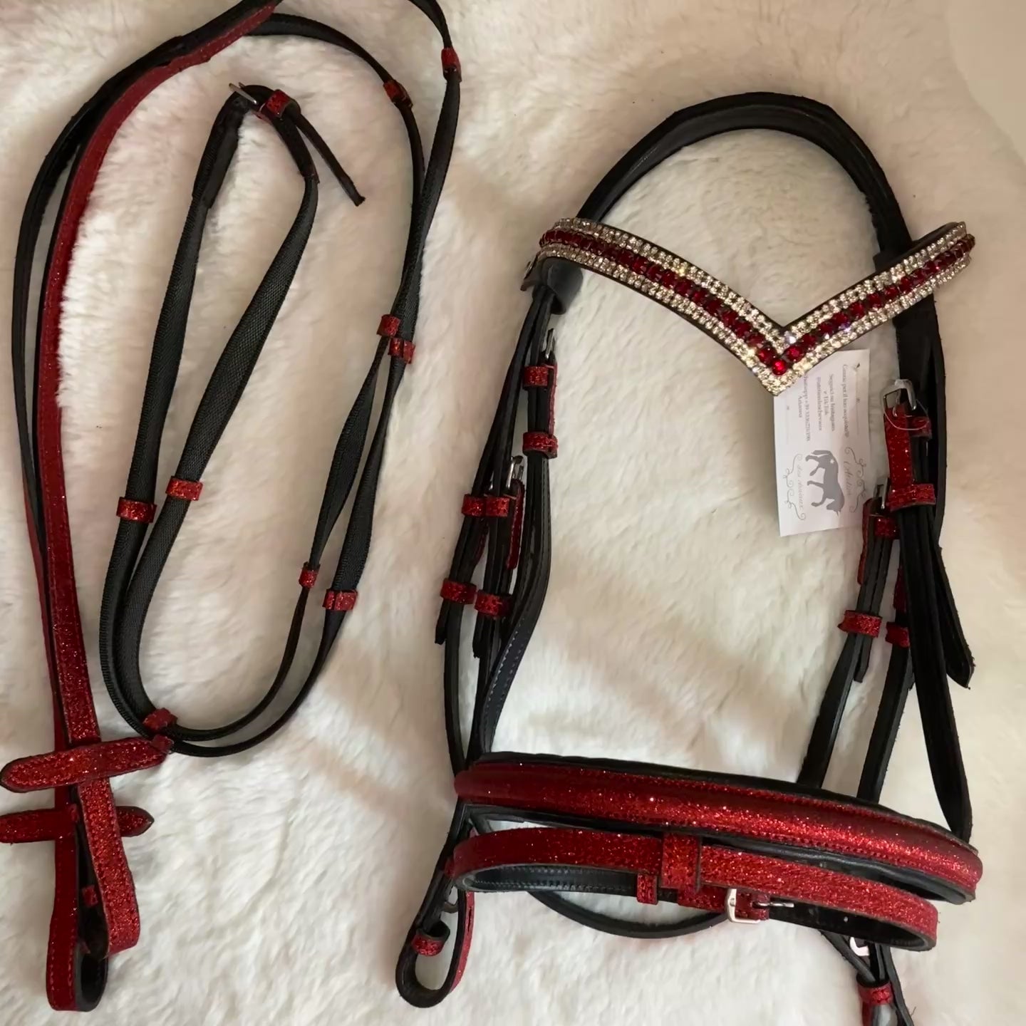 Splendida testiera con frontalino interamente scintillante, completa di redini in gomma glitterate in rosso per un grip ottimale e un tocco di eleganza. Il frontalino argentato presenta una striscia centrale di brillantini rossi, ed è dotato di pratici bottoncini che permettono di rimuoverlo e sostituirlo in pochi minuti, senza sforzo. La testiera include chiudibocca e redini coordinate ed è progettata con una struttura ergonomica per garantire il massimo comfort al cavallo, unendo stile e funzionalità in un solo accessorio. ❤️✨