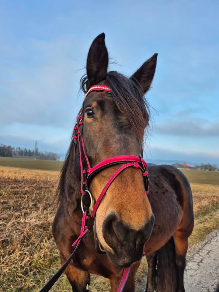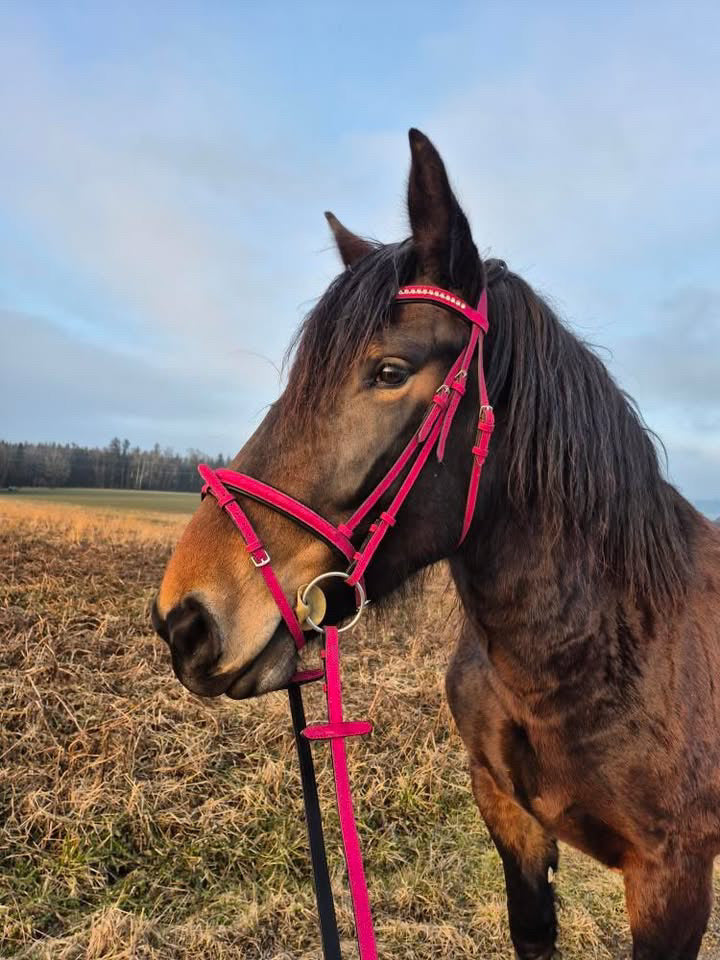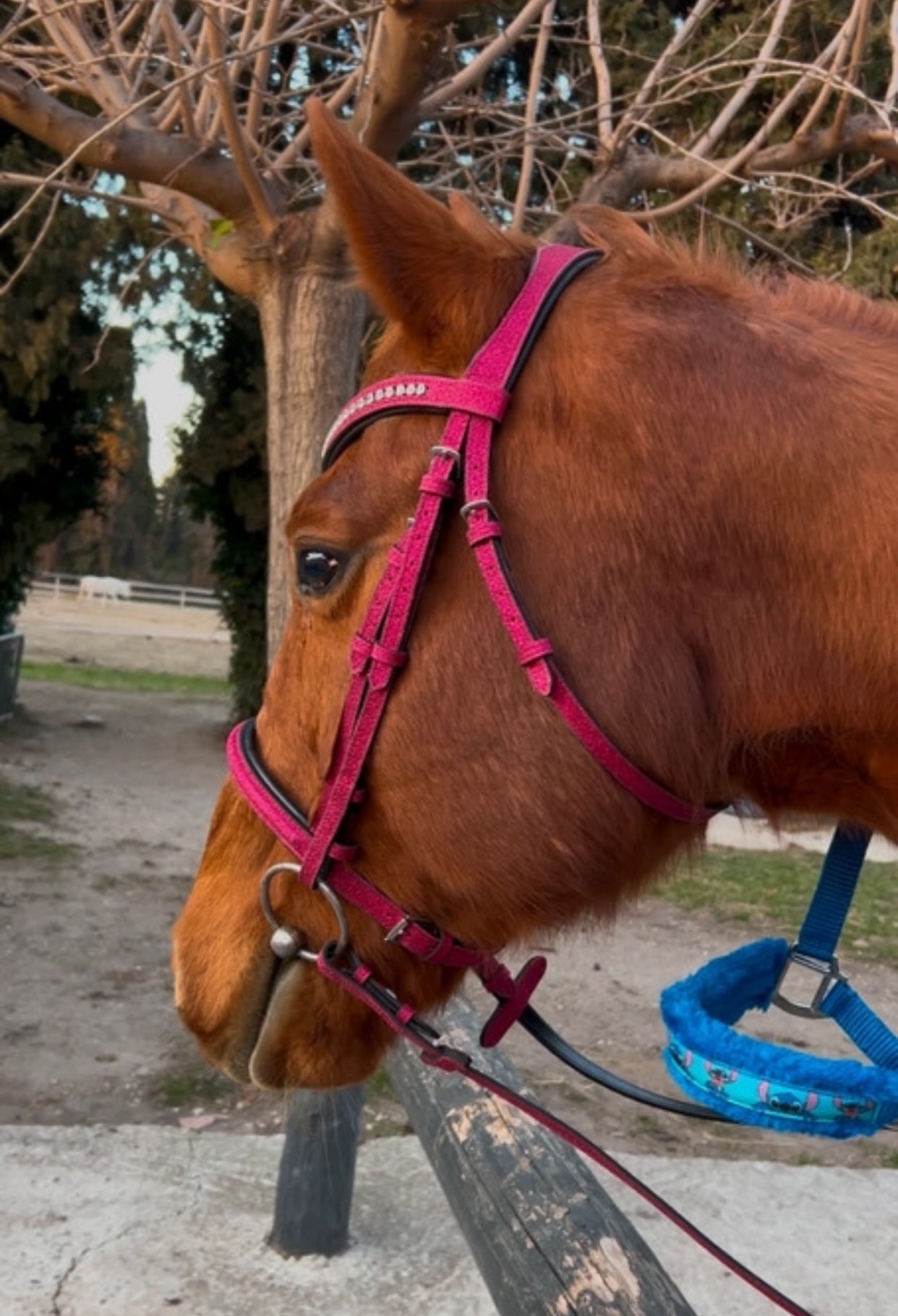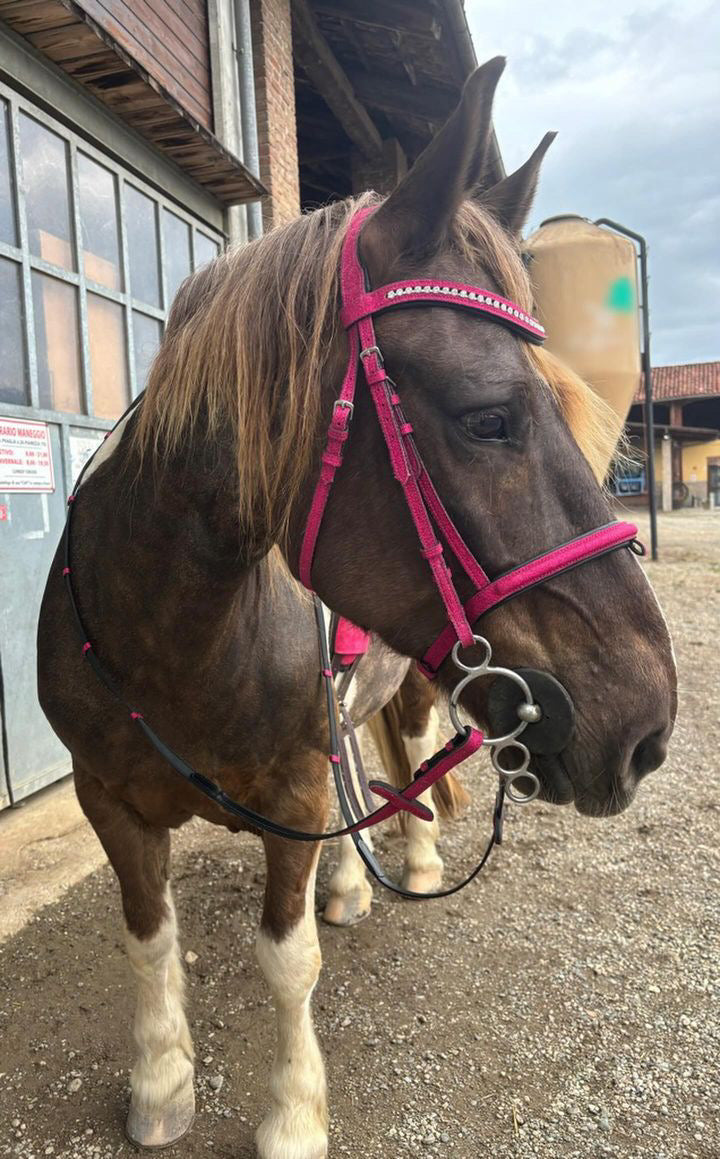 Dotata di un frontalino impreziosito da cristalli argento, aggiunge un tocco di luminosità che cattura lo sguardo. È inoltre completa di redini in gomma antiscivolo, per una presa sicura e confortevole durante la monta.