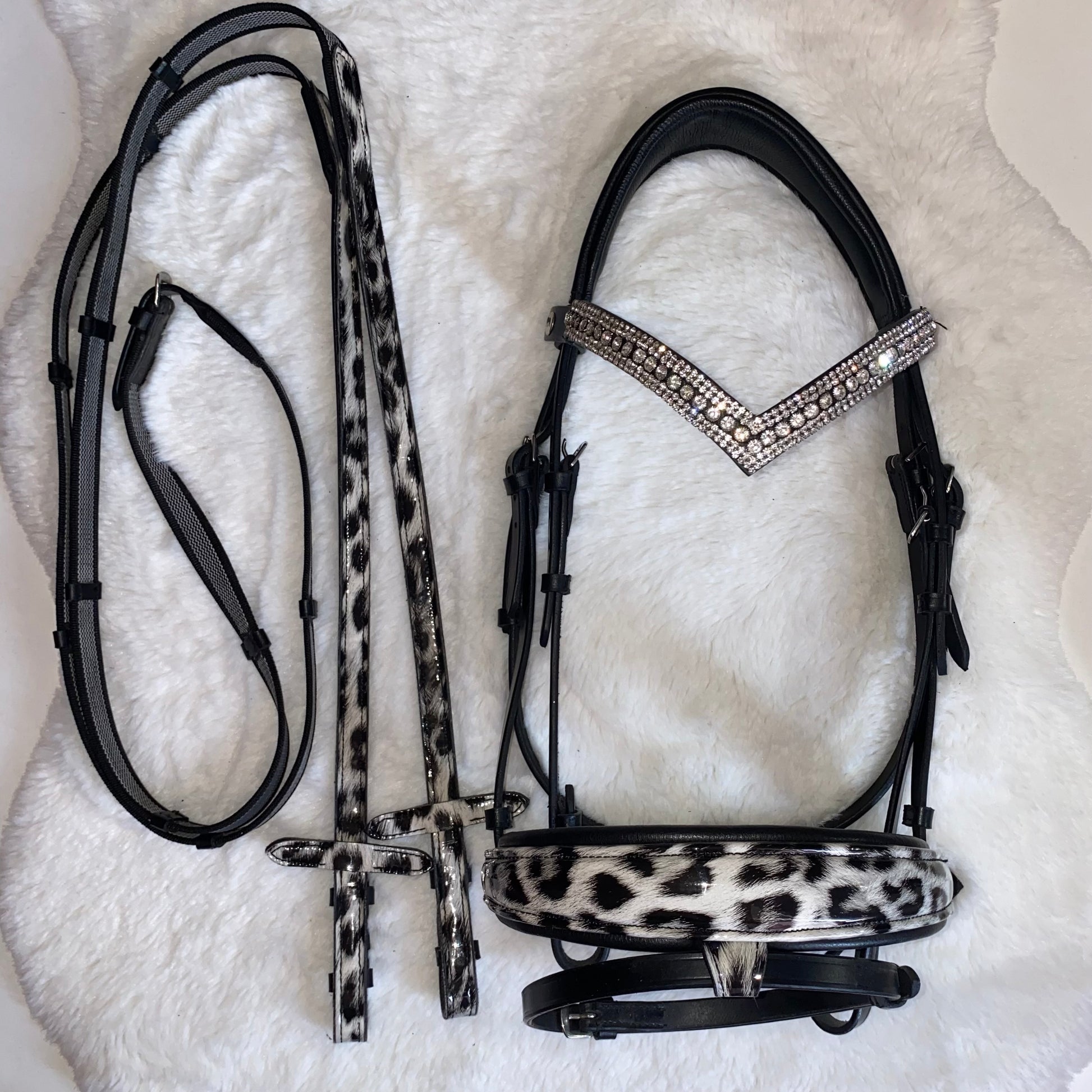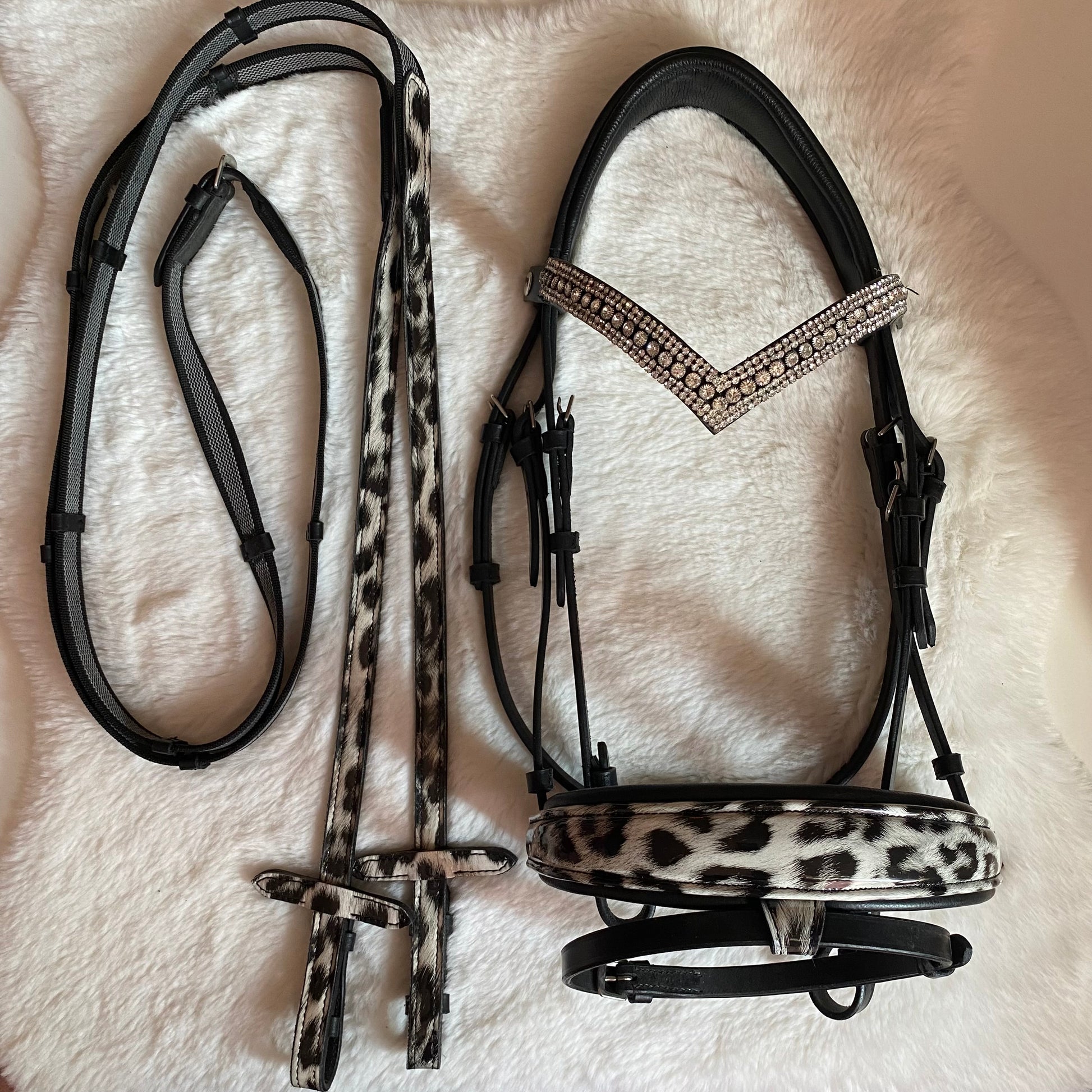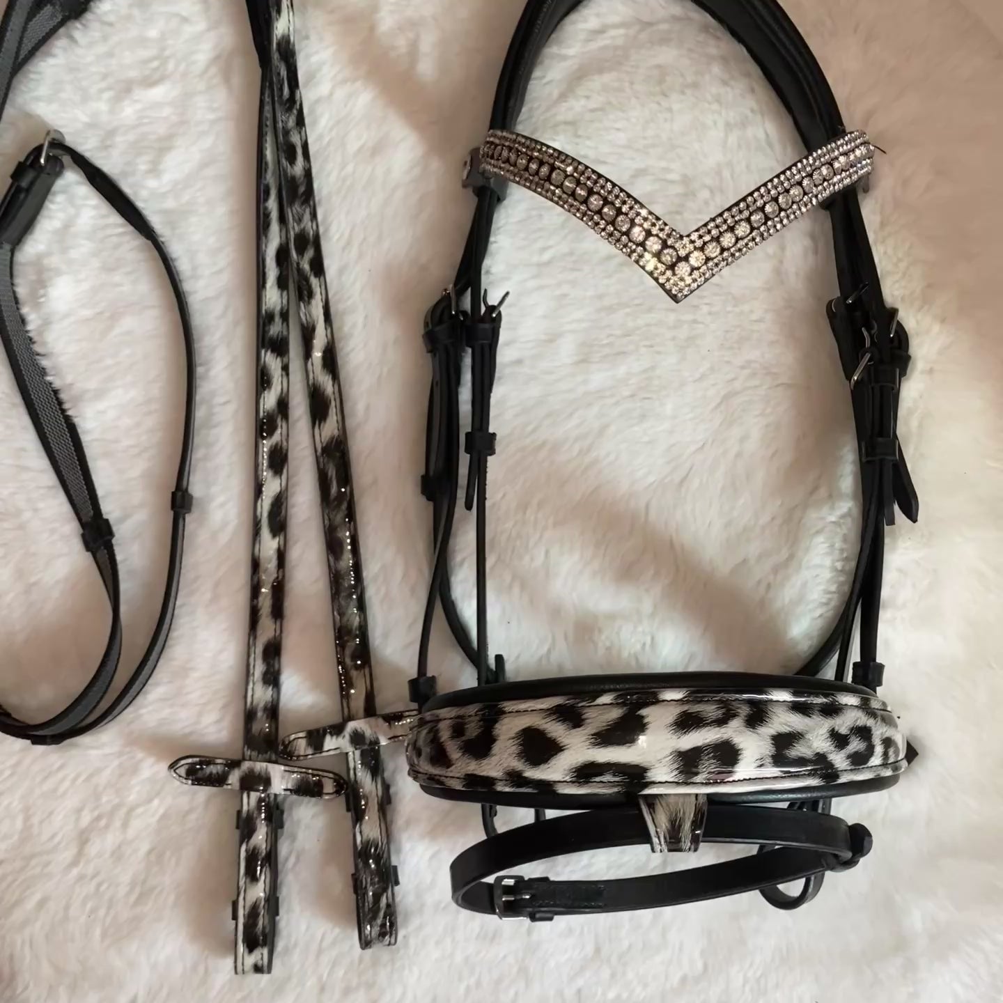 Elegante e di tendenza, questa testiera presenta nasalina e redini con fantasia leopardata lucida per un look unico e accattivante. Il frontalino in forma a “V” e in brillantini argento, aggiunge un tocco di classe. Realizzata con materiali di qualità e resistente all’uso, è completa di redini, frontalino e testiera, unendo stile e funzionalità in un solo prodotto.