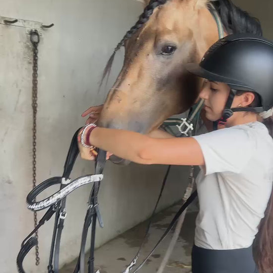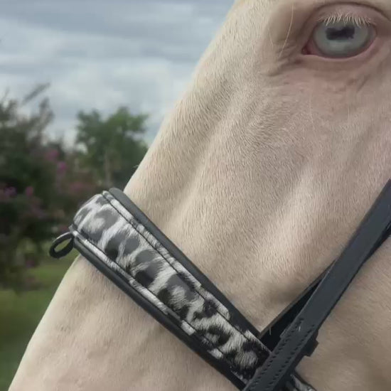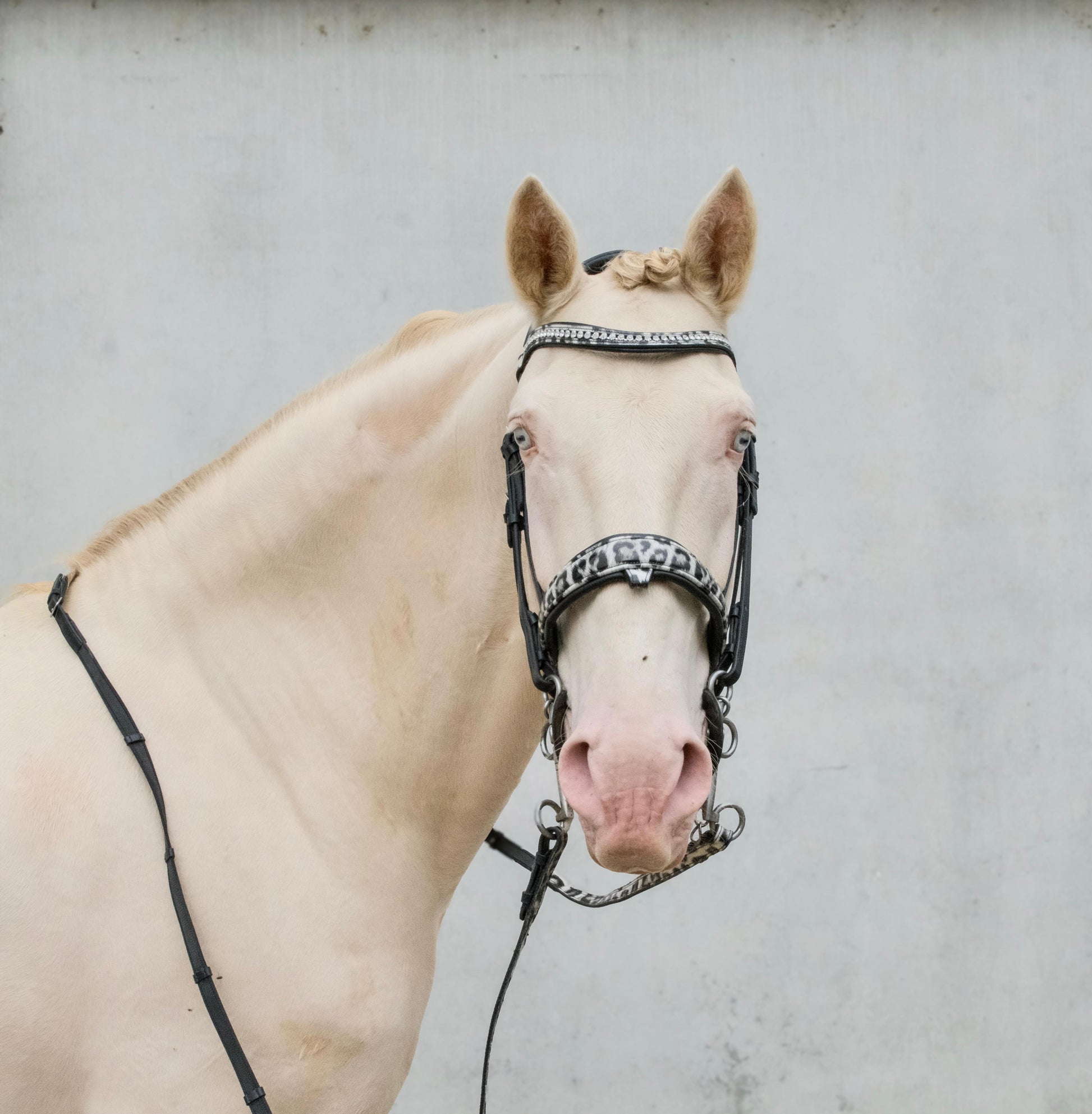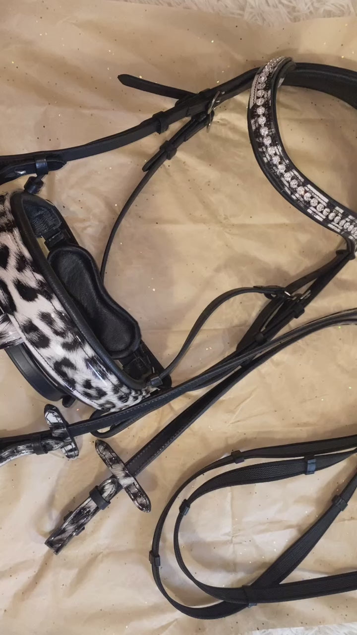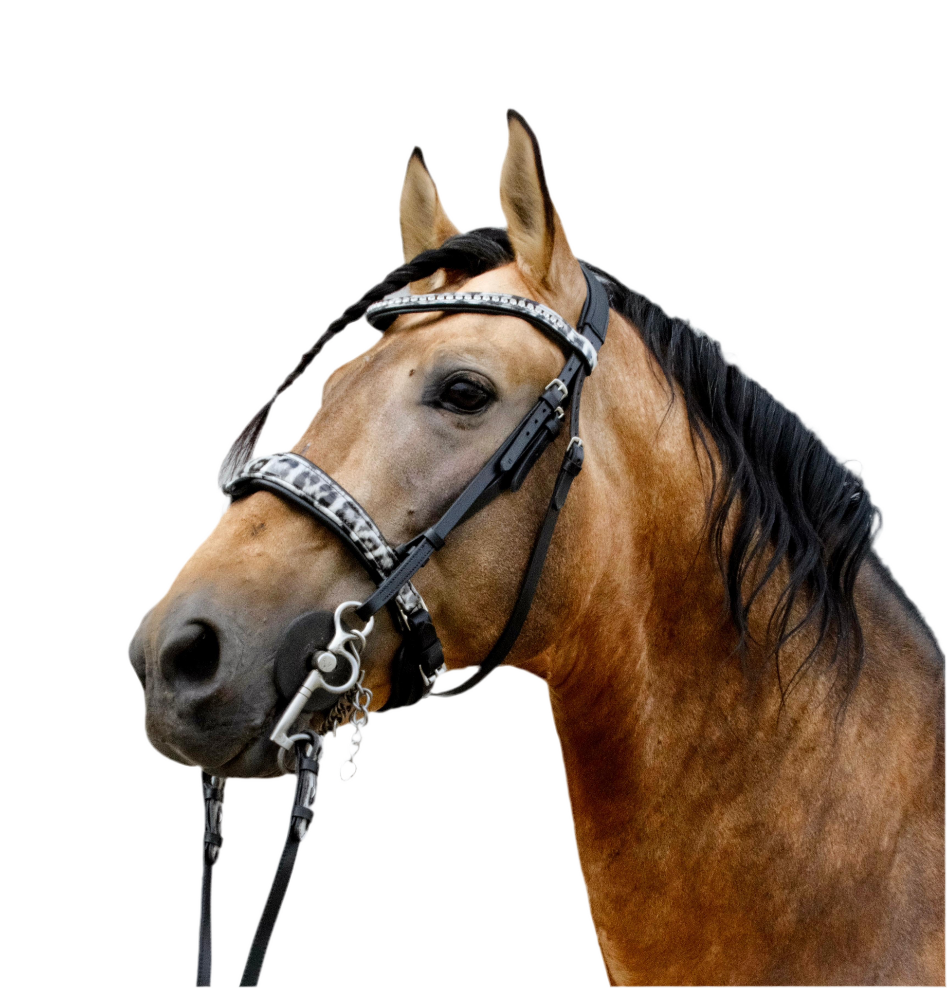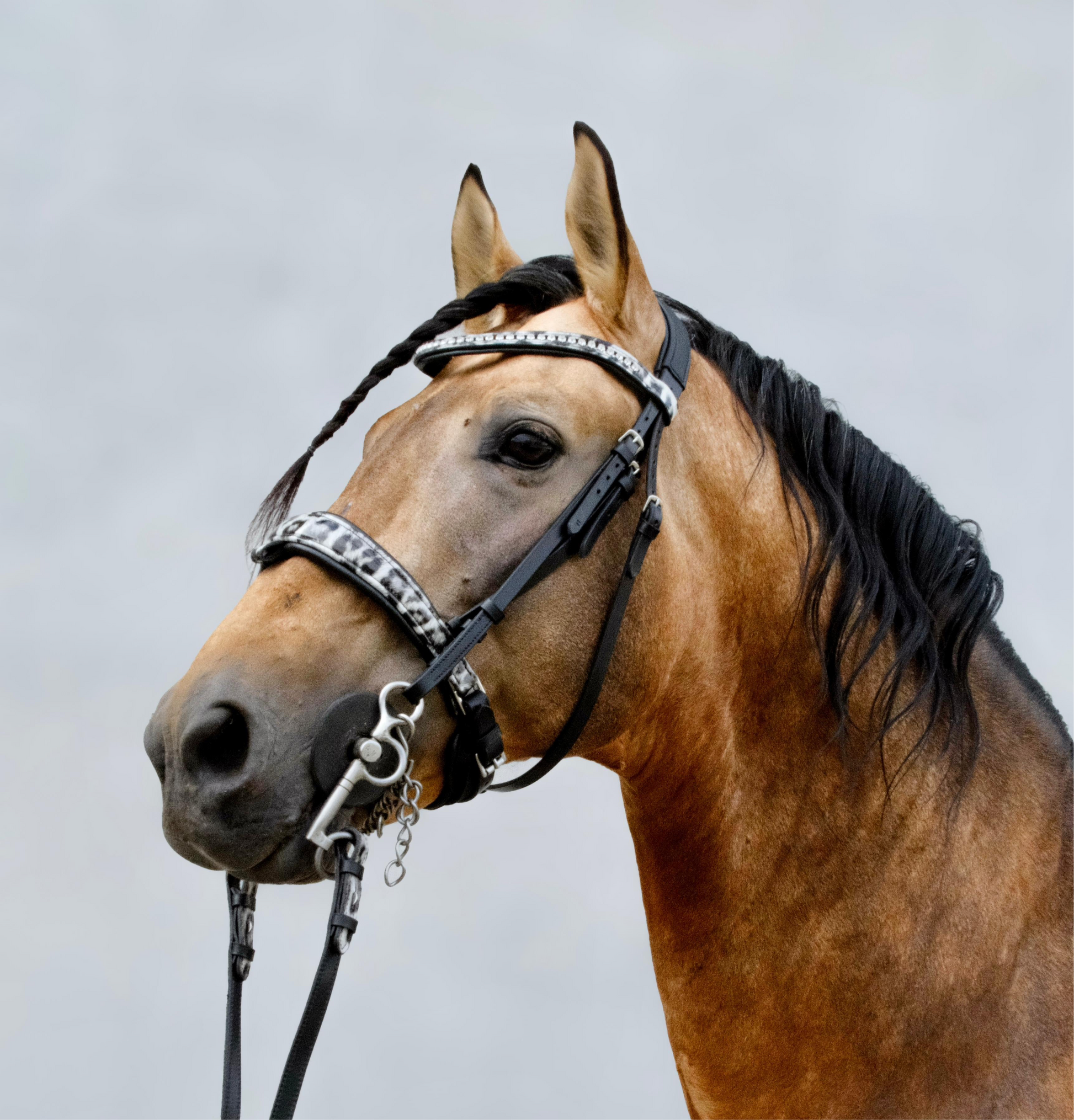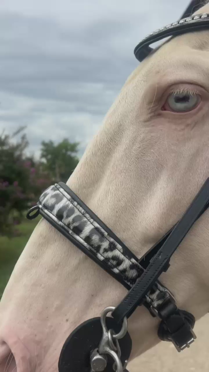 La testiera 'Leopard Lux' è l'accessorio ideale per chi vuole unire praticità e stile. Il motivo leopardato grigio-nero si abbina perfettamente a qualsiasi manto equino, mentre i diamanti argento sul frontalino aggiungono un tocco di lusso che non passerà inosservato in pista o nel paddock.