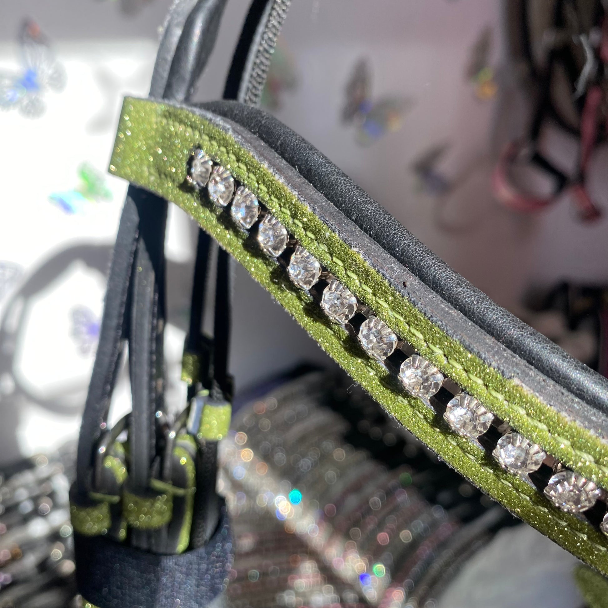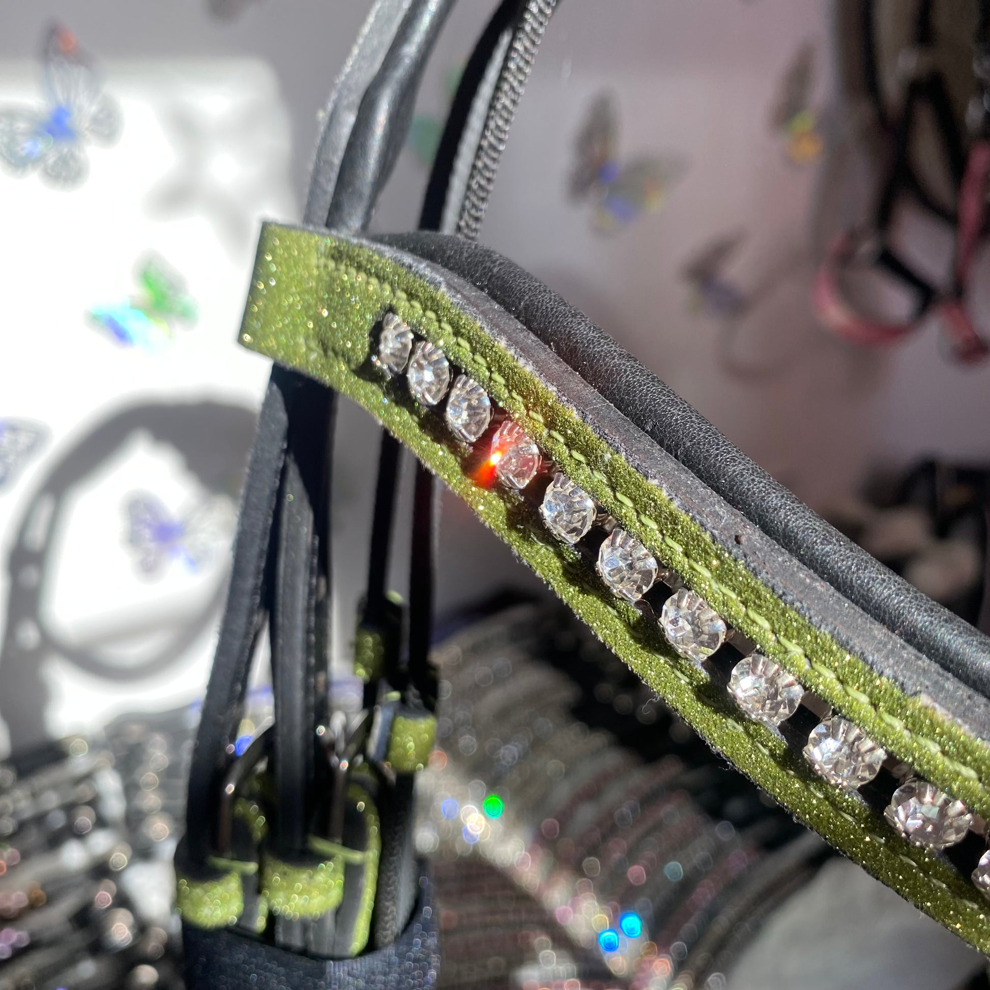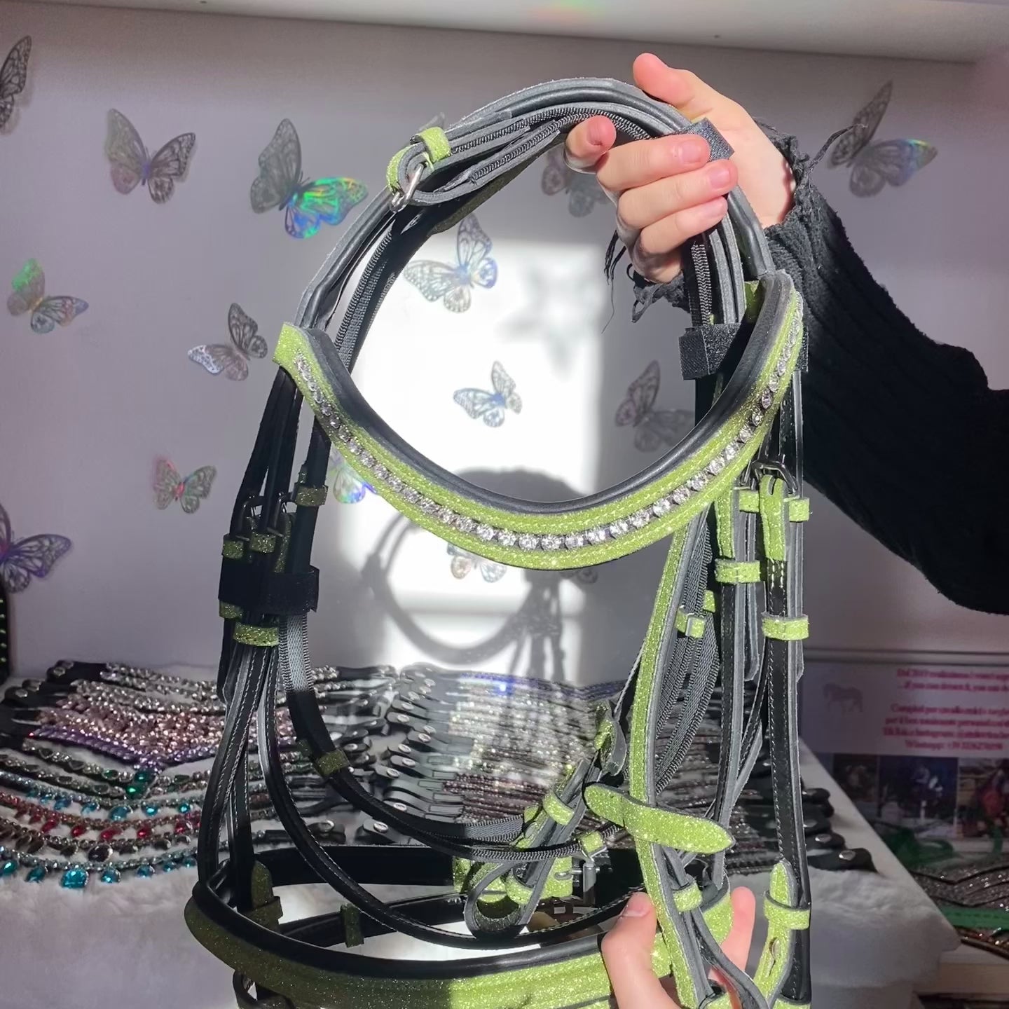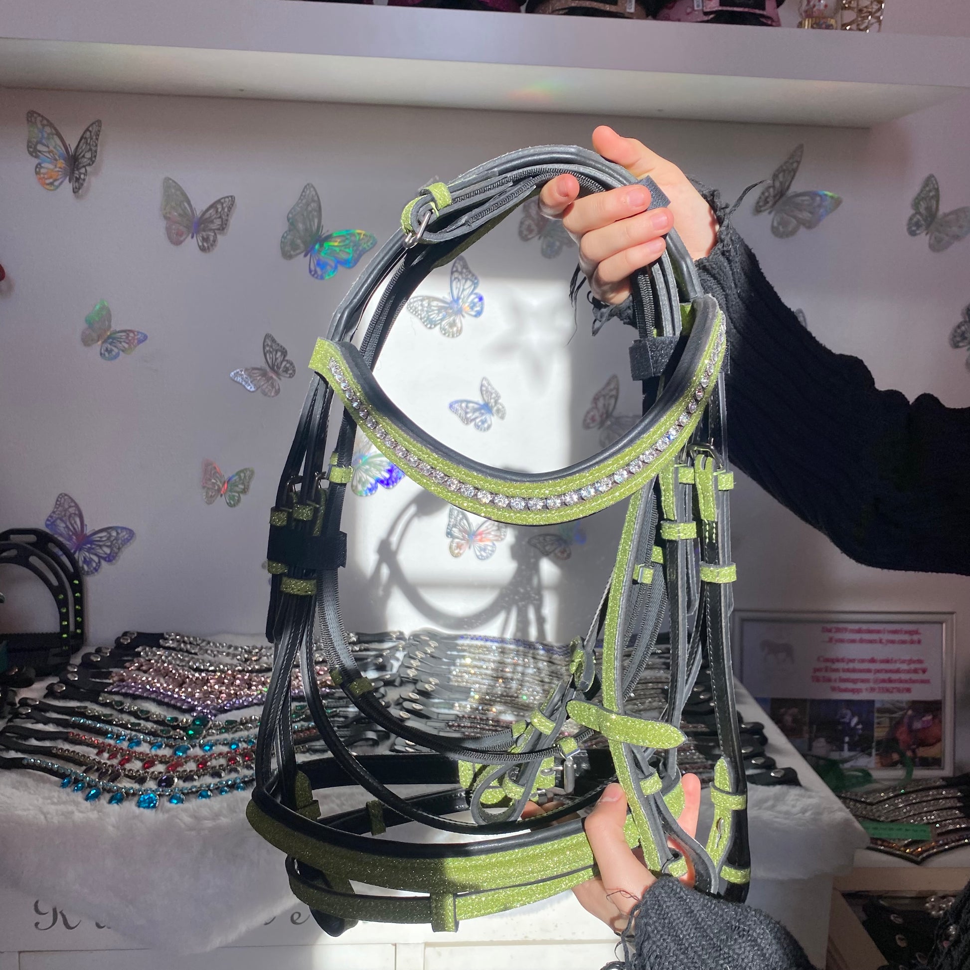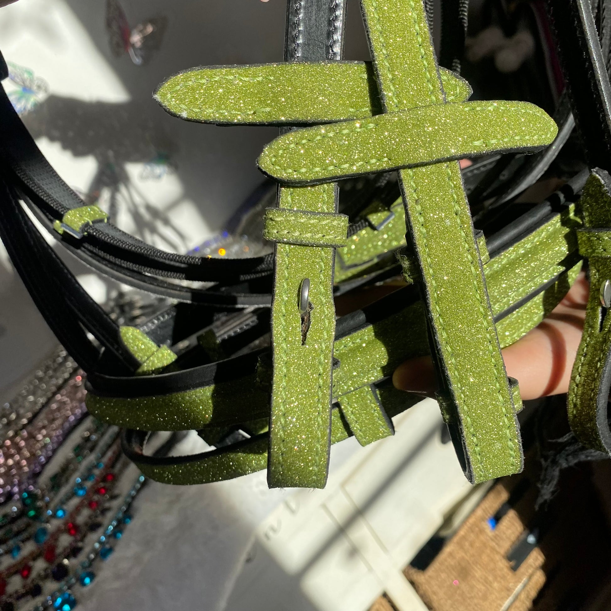 Aggiungi un tocco di magia primaverile alla tua attrezzatura equestre con la nostra affascinante testiera 'Glitter Mint'. Questo accessorio unico combina eleganza delicata e brillantezza accattivante per i cavalieri che desiderano un look fresco e sofisticato.
